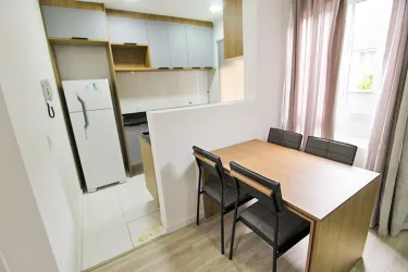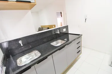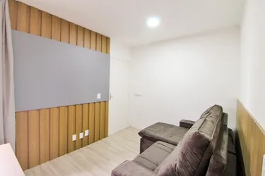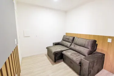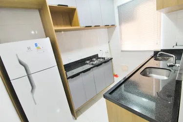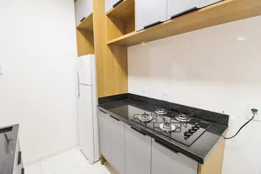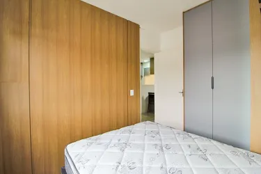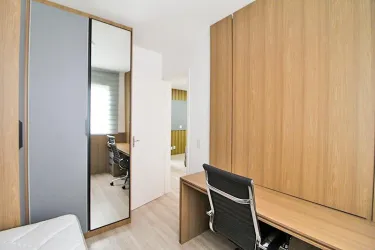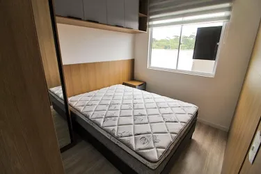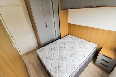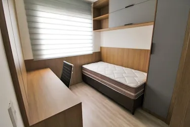 Apartamento de 2 quartos com piso laminado, sendo 01 com cama box casal, cabeceira embutida, armários e 01 com cama box solteiro, escrivaninha, cadeira giratória, armários;
