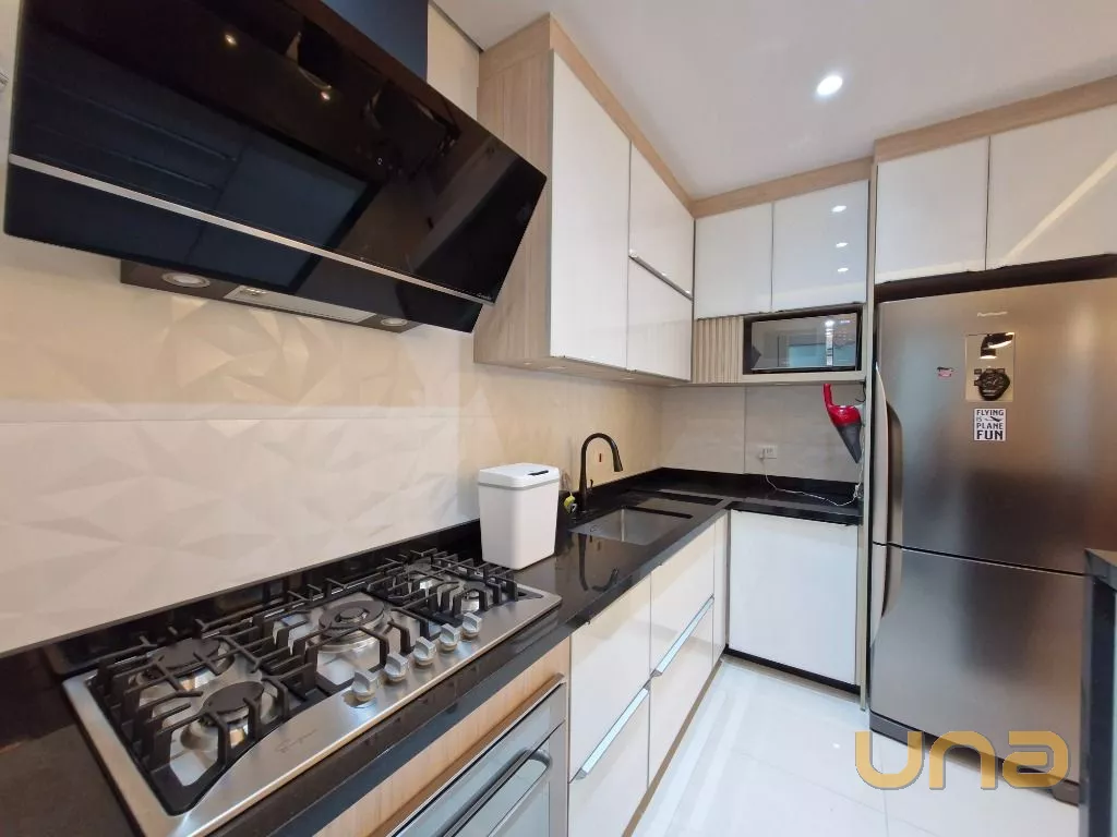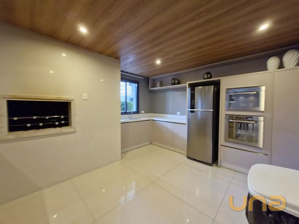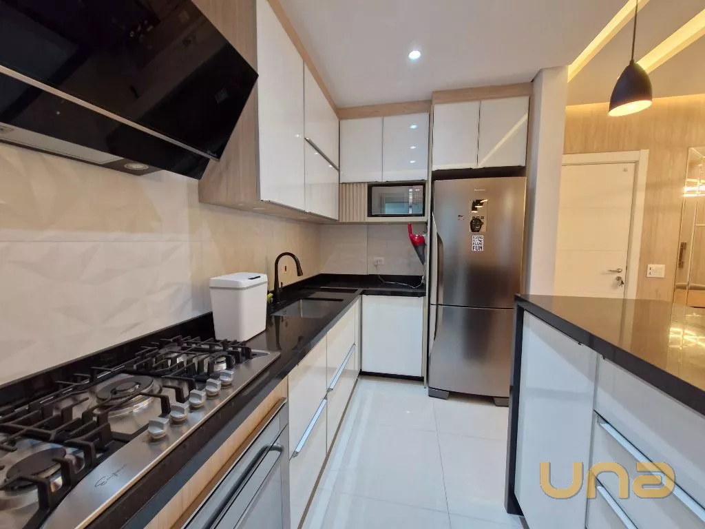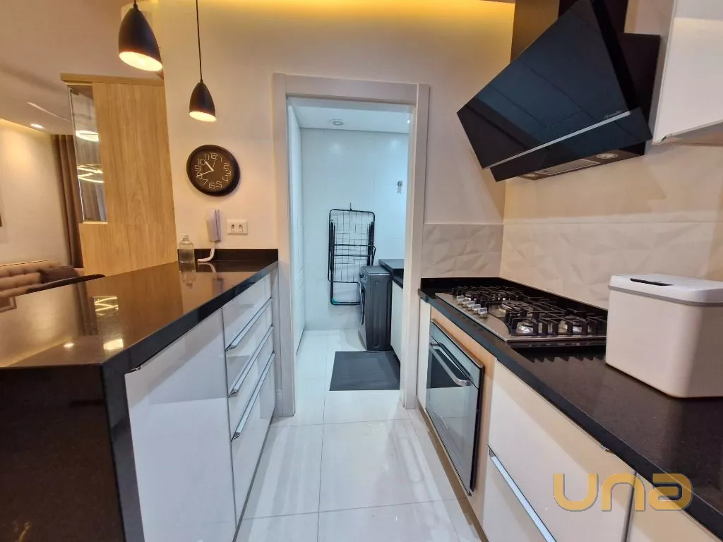 Cozinha: Completa com armários planejados, geladeira, micro-ondas, cooktop com coifa, forno e ampla bancada.