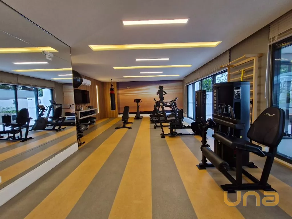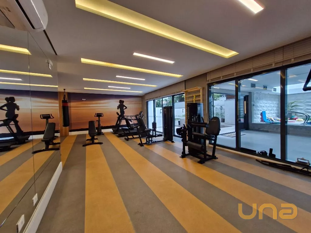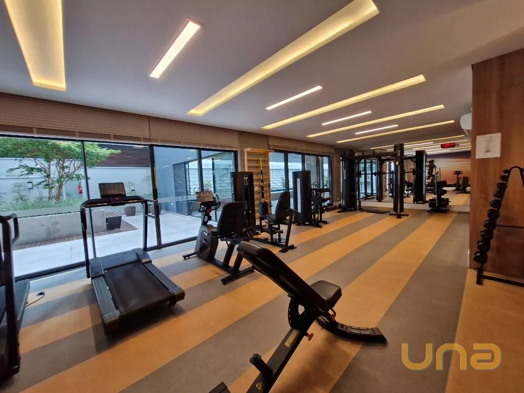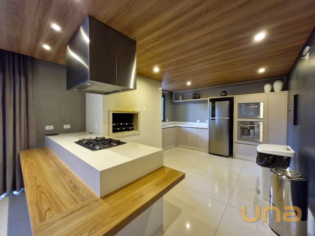 Cozinha: Completa com armários planejados, geladeira, micro-ondas, cooktop com coifa, forno e ampla bancada.