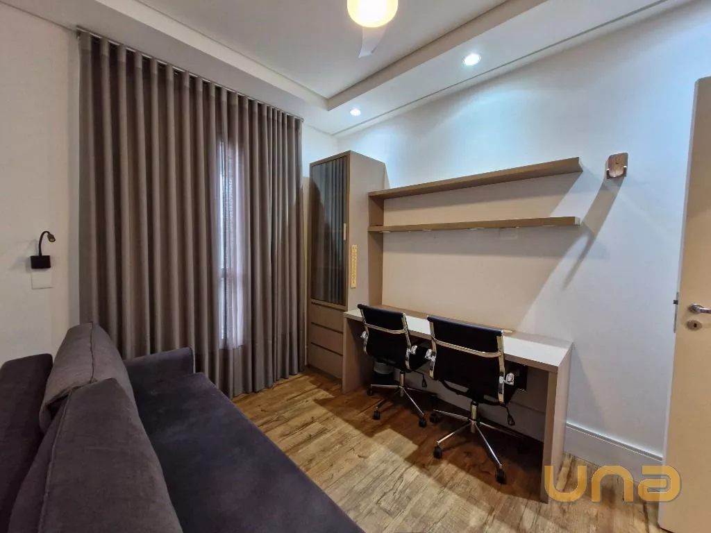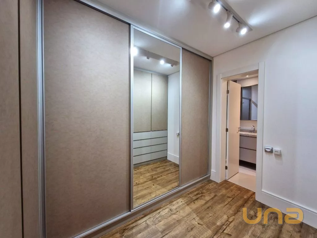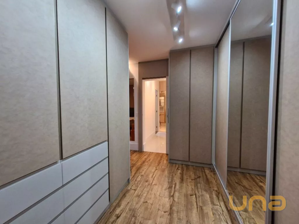 Suíte Master: Quarto mobiliado com cama confortável, aquecedor, TV, cortinas e closet com armários planejados. Banheiro da suíte com armário sob medida e excelente acabamento.
