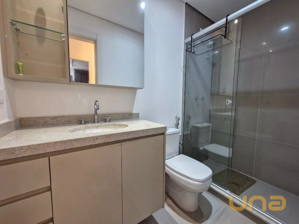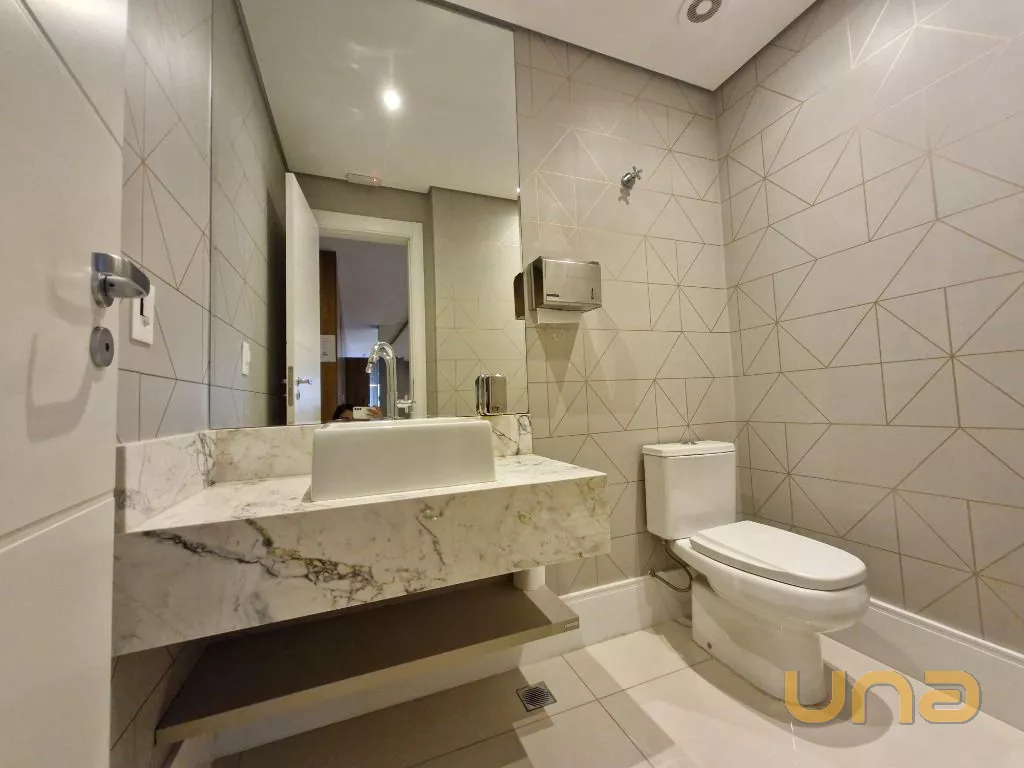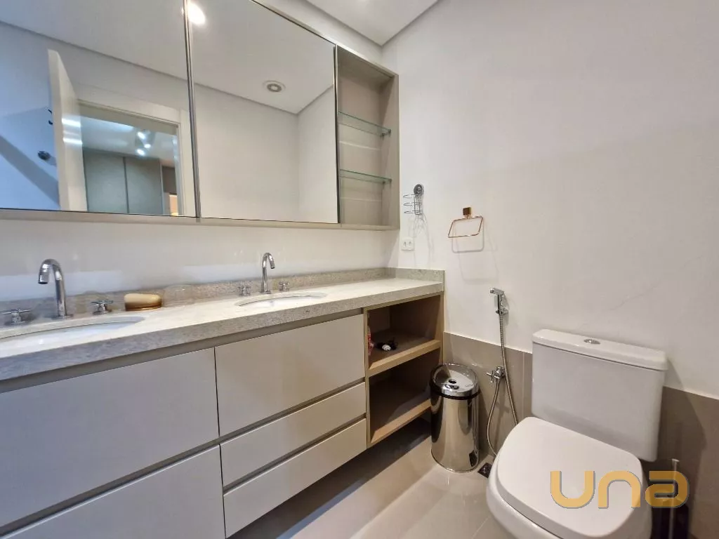 Banheiro Social: Com móveis planejados e acabamento.