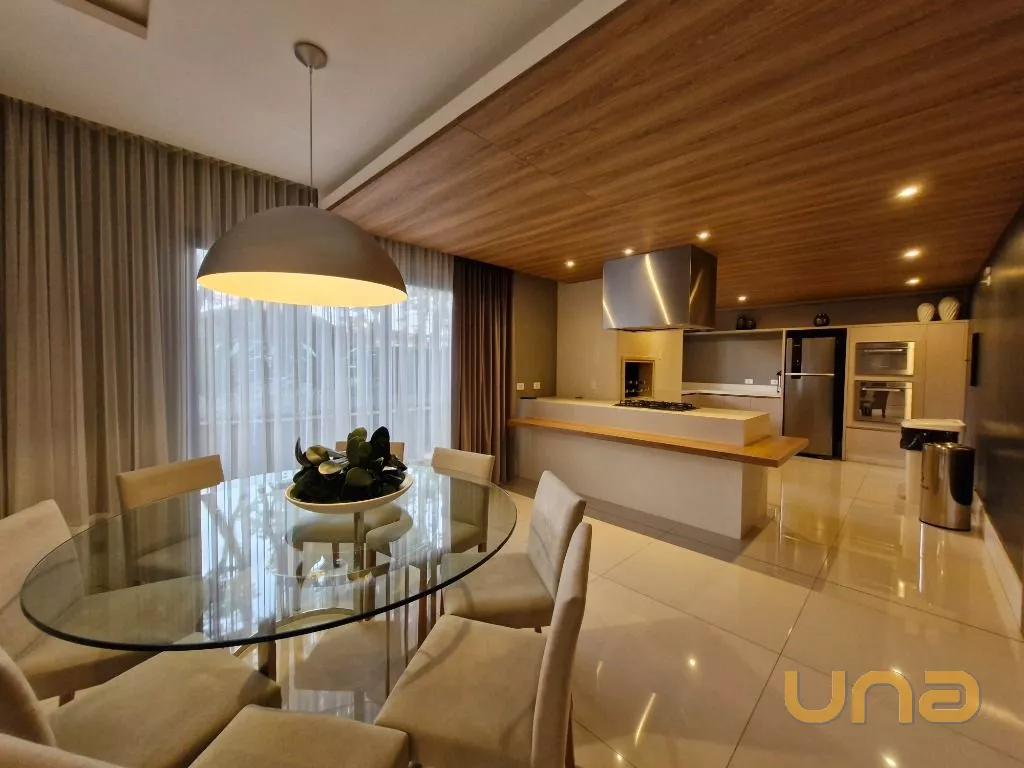 Sala de Jantar: Mesa com cadeiras, lustre sofisticado e espelhos decorativos, proporcionando um ambiente aconchegante e moderno.