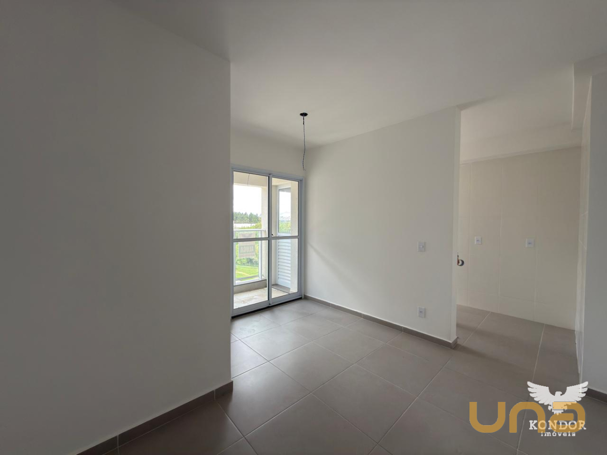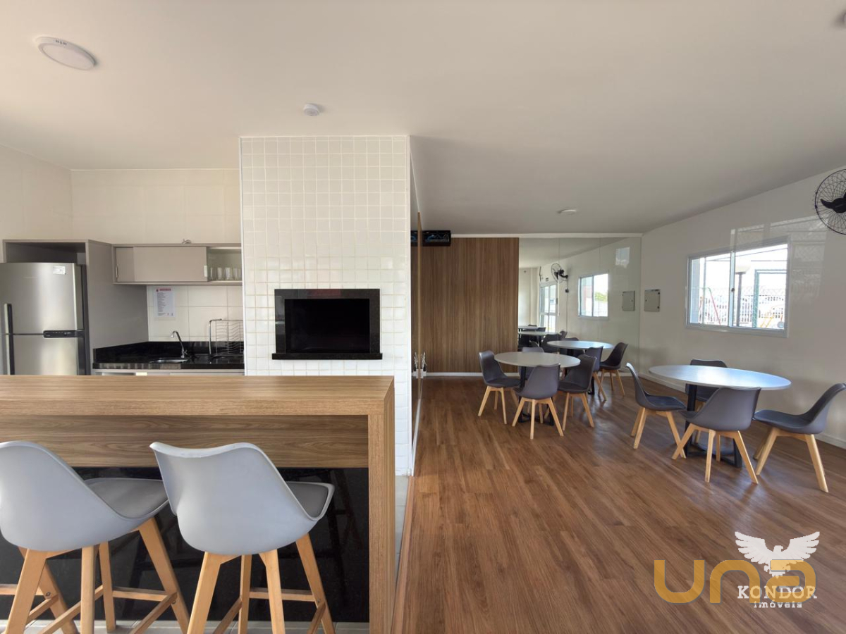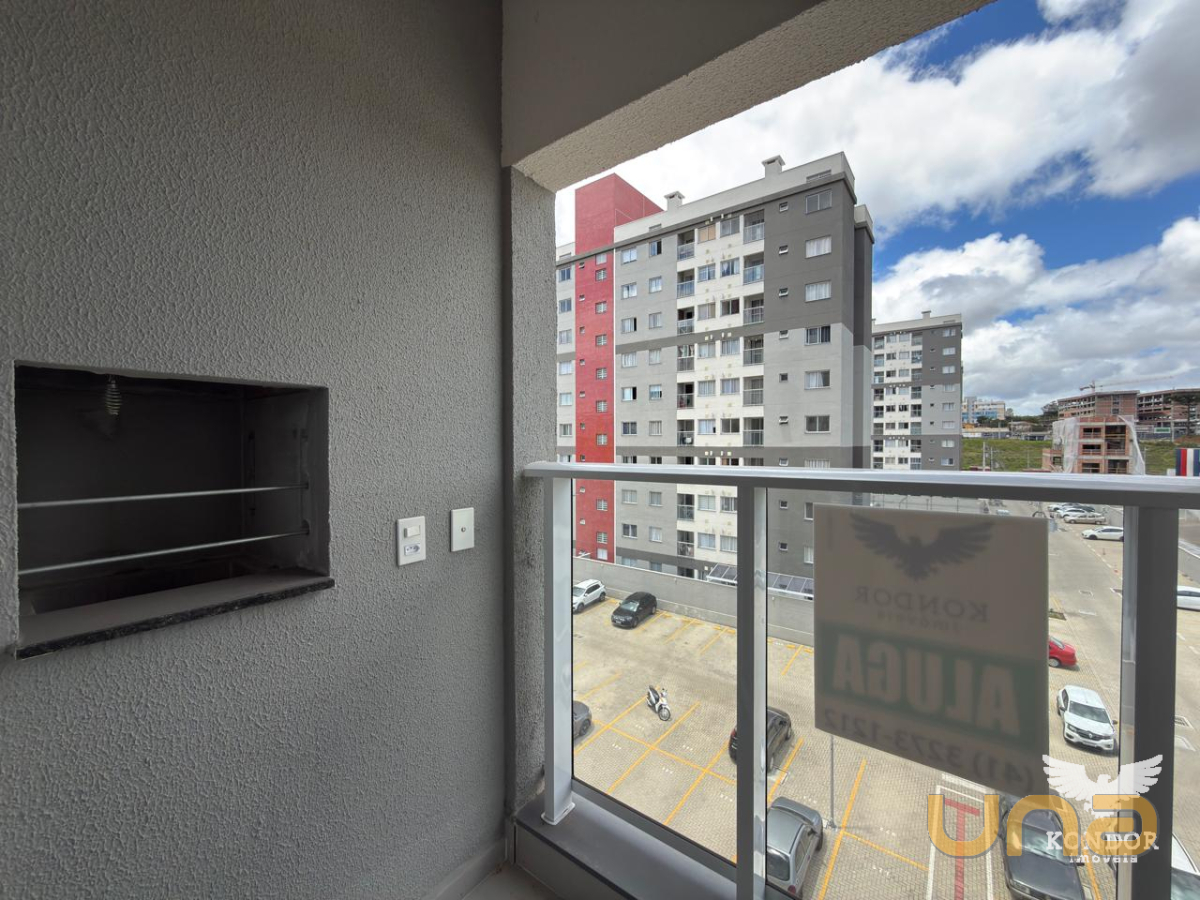 Apartamento para locação – 2 quartos, sala, cozinha com área de serviço, sacada com churrasqueira, e 1 vaga de estacionamento.