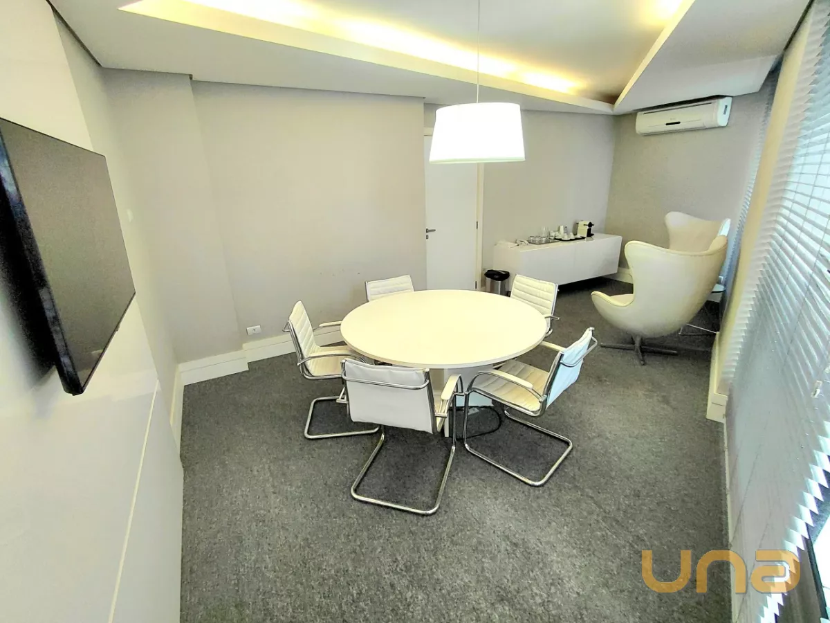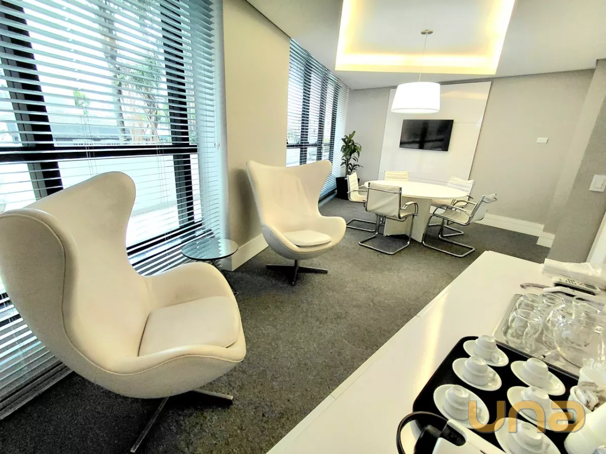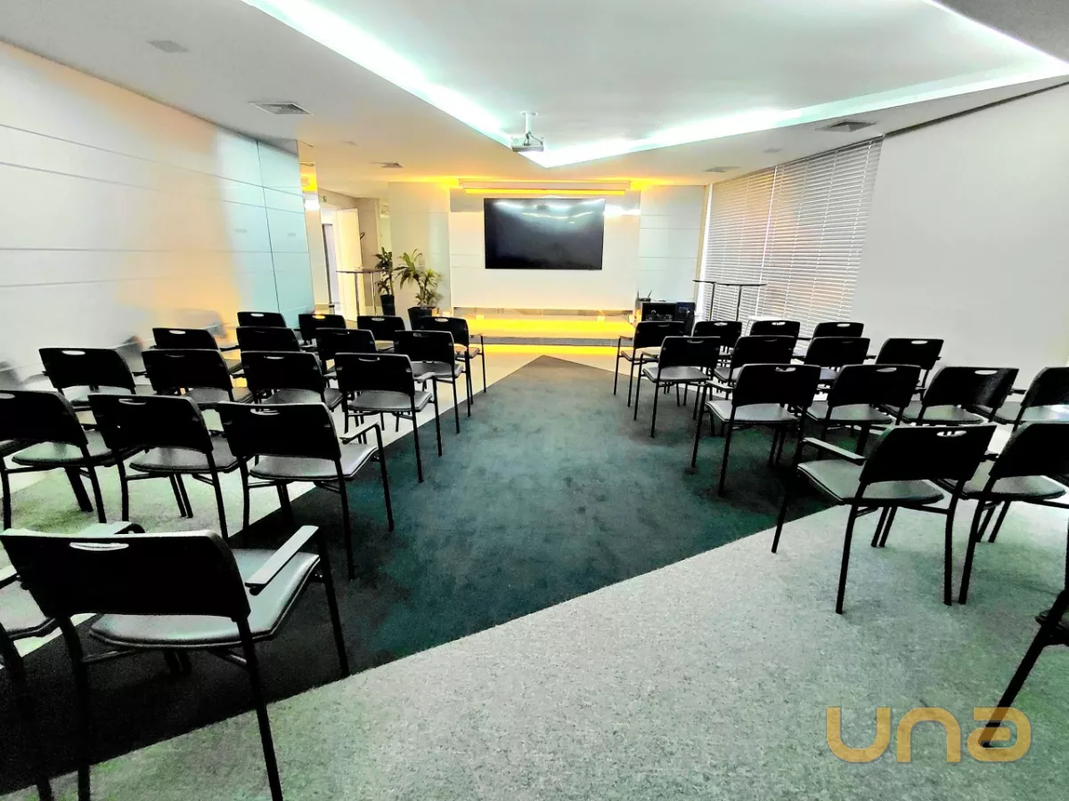 Detalhes: SALA COM 07 MESAS E CADEIRAS, ARMÁRIOS, MESA DE REUNIÃO, TV, FRIGOBAR / BWC SOCIAL COM BALCÃO E ARMÁRIO SUSPENSO / SACADA PRIVATIVA.