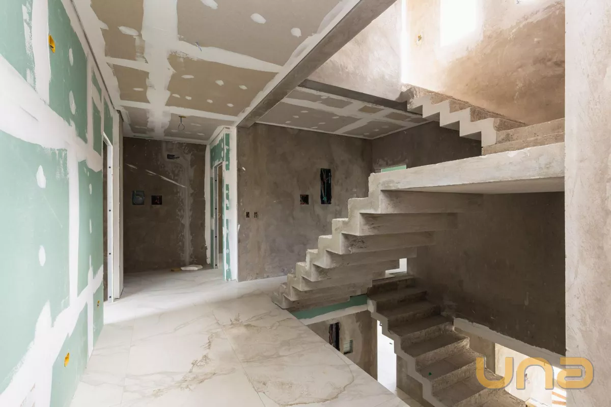Salas planejadas distribuídas entre os pavimentos, com piso em porcelanato e acabamento em gesso