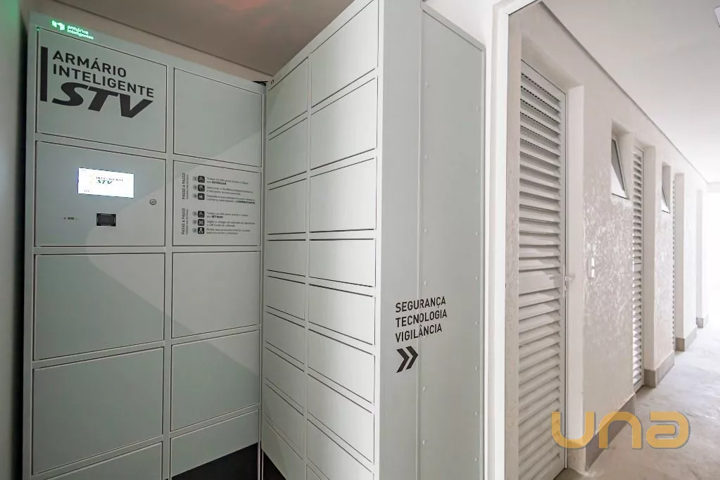 Sistema de portaria remota e empresa de monitoramento STV em que as entregas são colocadas em um espaço individual de cada apartamento, zelador em horário comercial, 2 elevadores (social e de serviço).