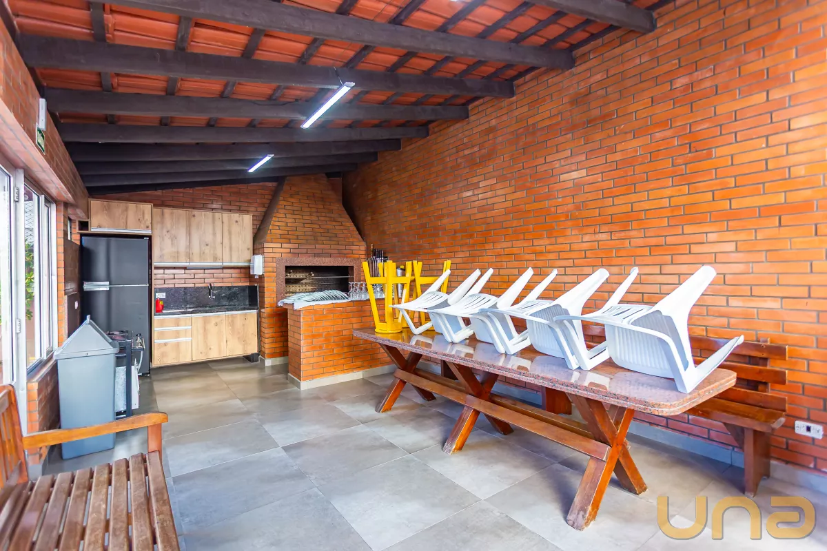 Ampla sala para dois ambientes (estar e jantar), o espaço conta com TV, e uma bela lareira, cozinha é funcional e bem equipada, com armários planejados, fogão e uma mesa para contemplar o espaço. Banheiro social, e uma área de serviço completa, com armários e praticidade no dia a dia.