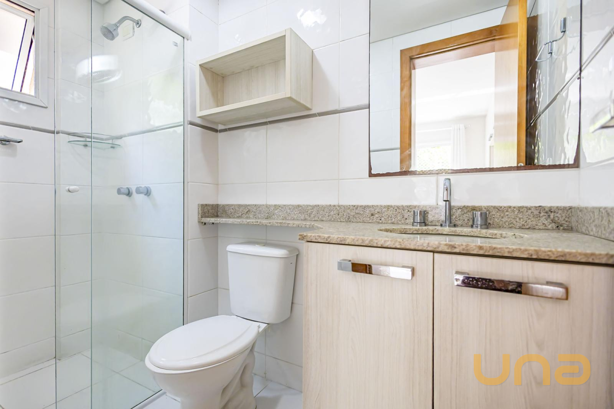 -Suíte e bwc social equipados com box em vidro, armário e espelho.