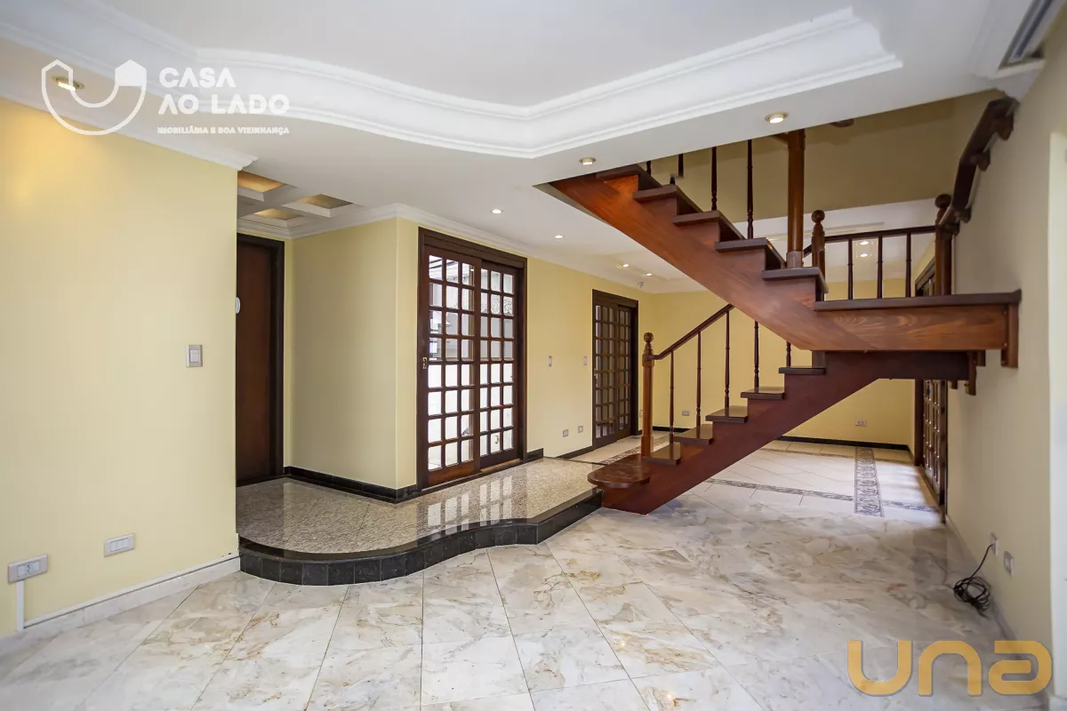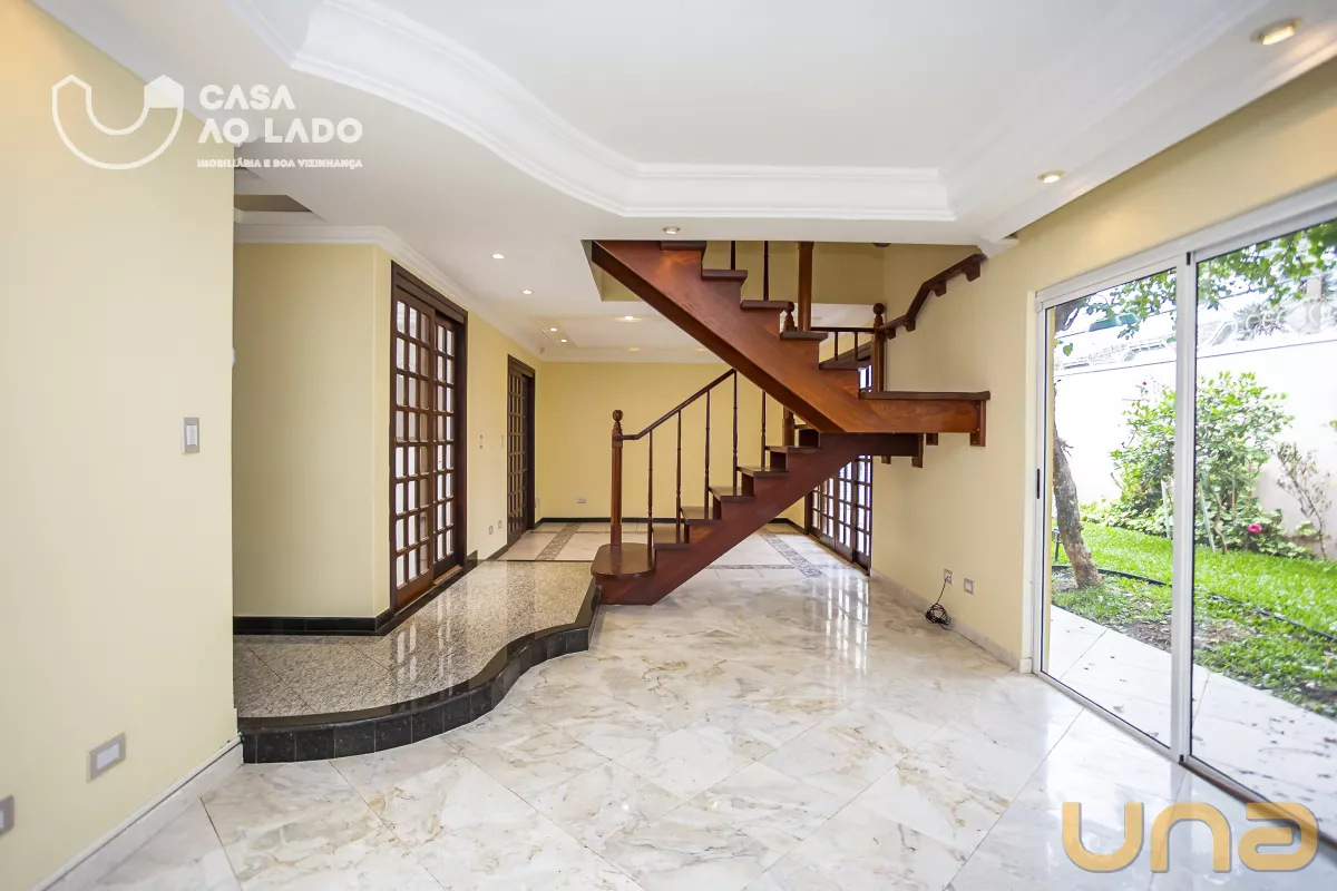 O imóvel é dividido em dois pavimentos, sendo o primeiro distribuído em hall de entrada com lavabo, sala de estar com lareira e porta de vidro com acesso ao jardim, sala de jantar é integrada com a de estar, cozinha com armários, geladeira, fogão com coifa e máquina de lavar louças, além da área de serviço, com banheiro e 01 quarto, que também pode ser usado com despensa, imóvel também conta com um espaço gourmet com churrasqueira.