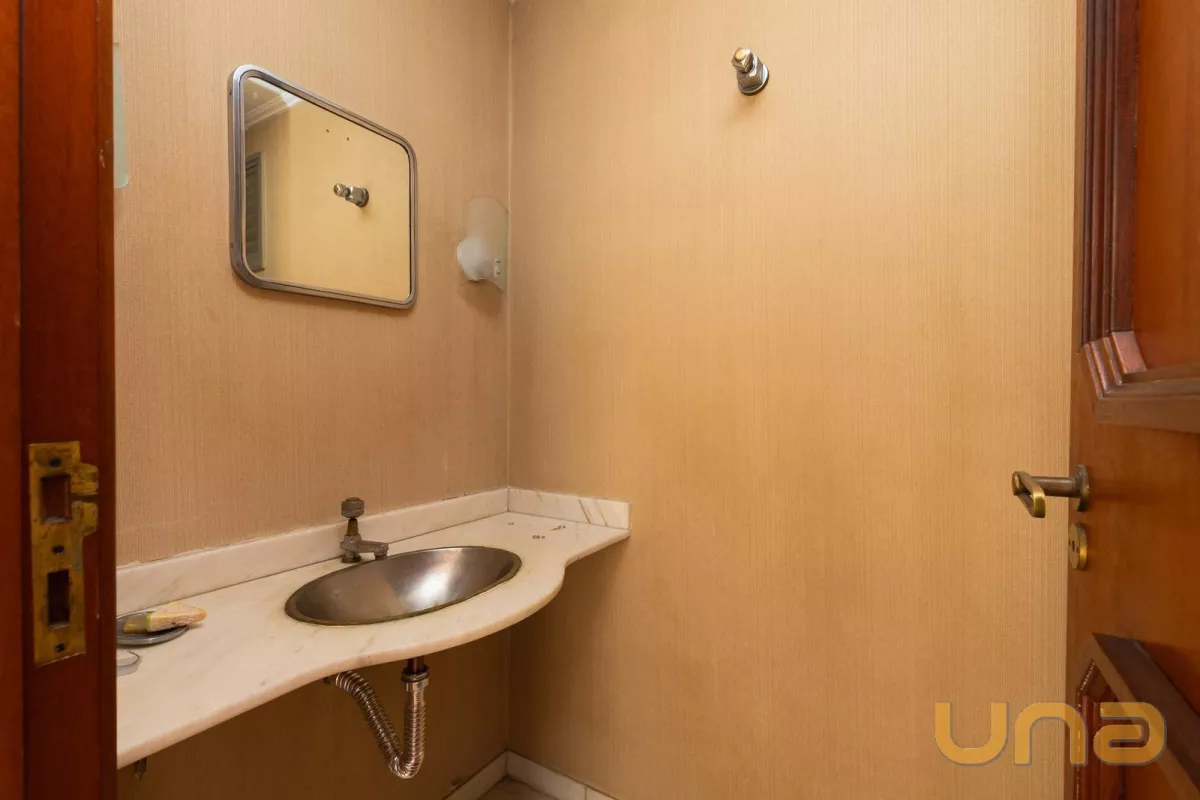 Lavabo com espelho, vaso e pia – um toque de sofisticação para receber suas visitas.