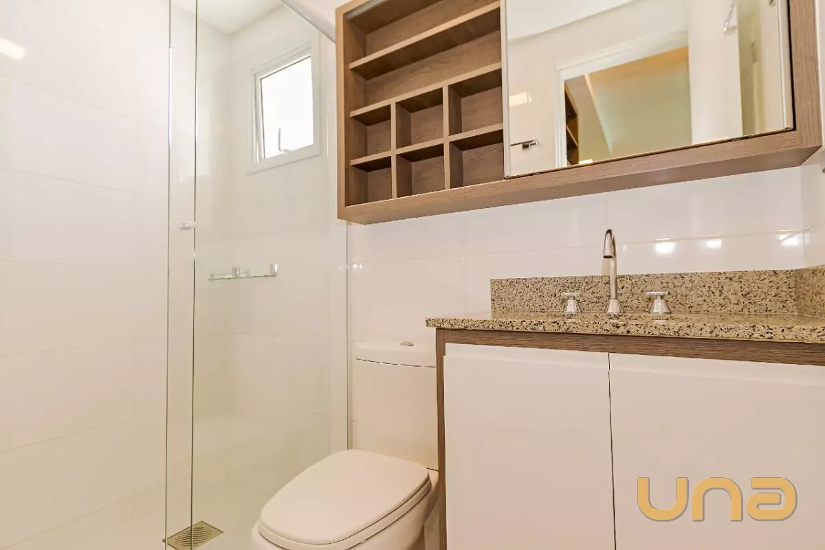 - 1 Banheiro social com box em vidro, armário com tampo em granito