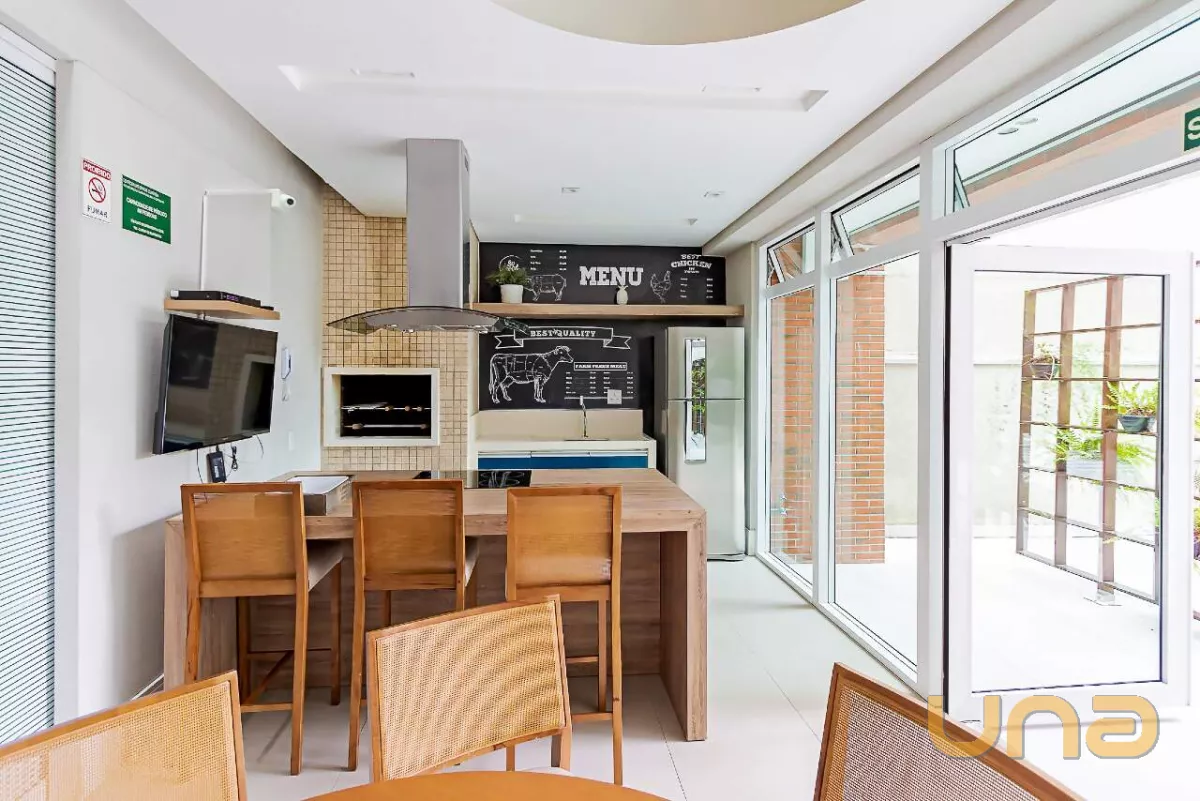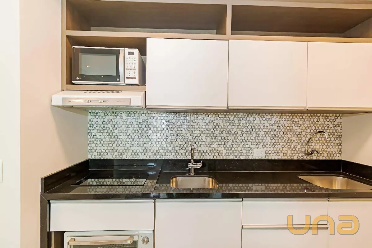 - Cozinha estilo americana com armarios sob medida, cooktop, microondas, sugar, forno elétrico, geladeira