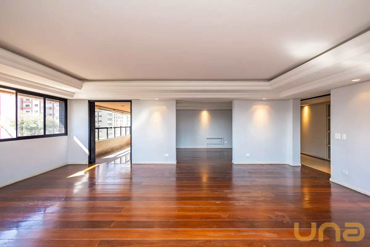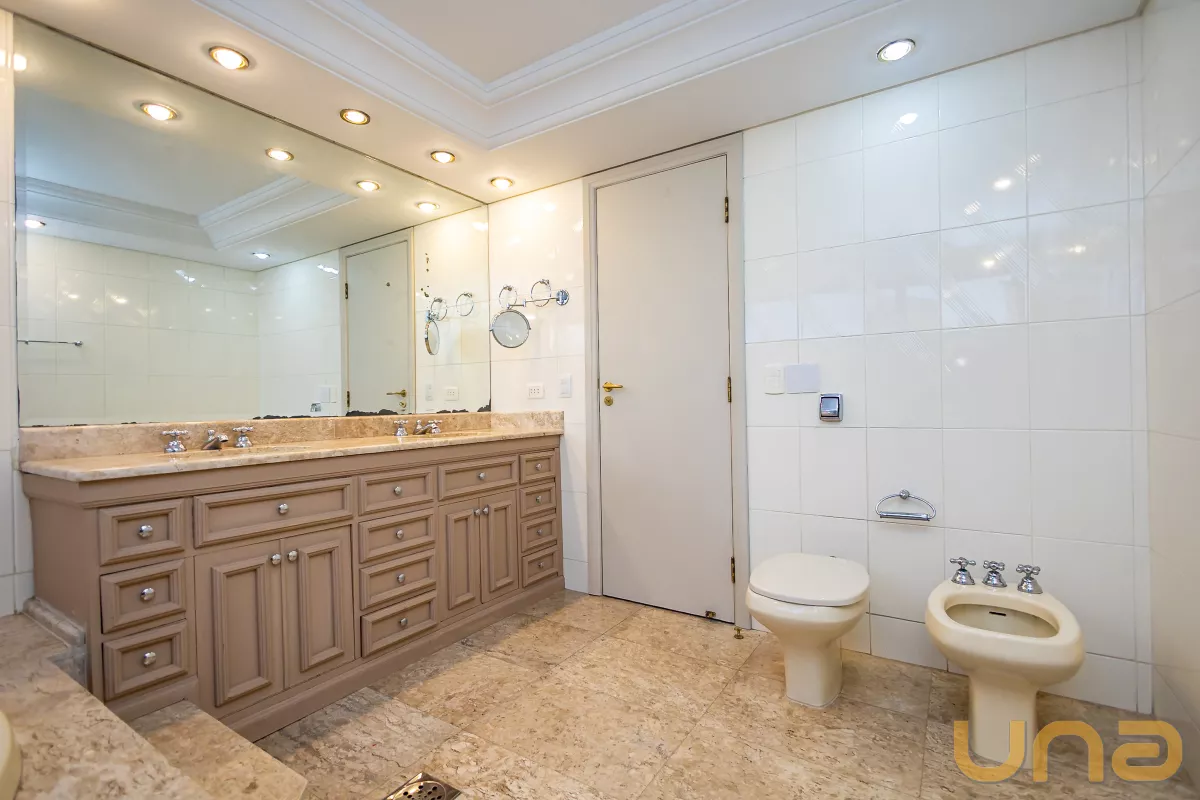 Apartamento com 4 suites, a principal com hidromassagem, amplo closet, espaçosa sacada, escritório, lavabo, sala de jantar, sala de estar, sala de TV e sala íntima, copa, cozinha, área de serviço, despensa e dependência completa de empregada.