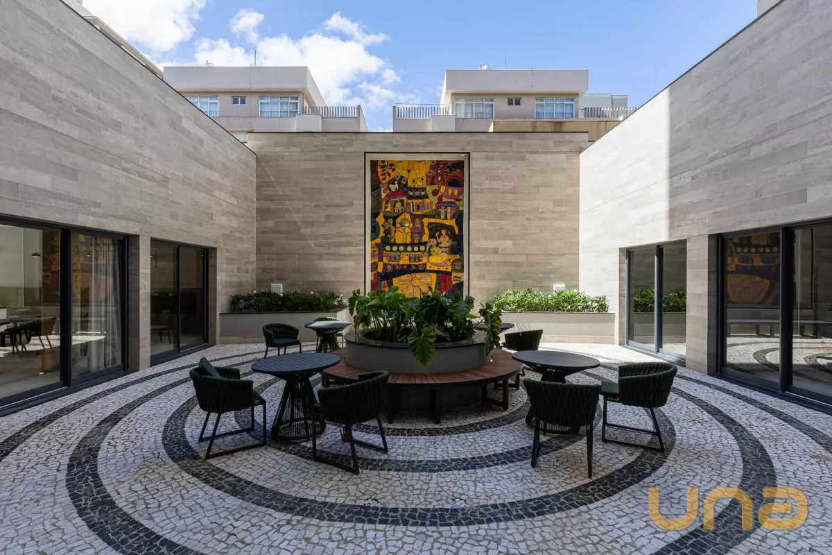 O prédio também conta com a Praça Franco Giglio, um espaço para convivência e contemplação com a obra de arte restaurada do artista Franco Giglio.