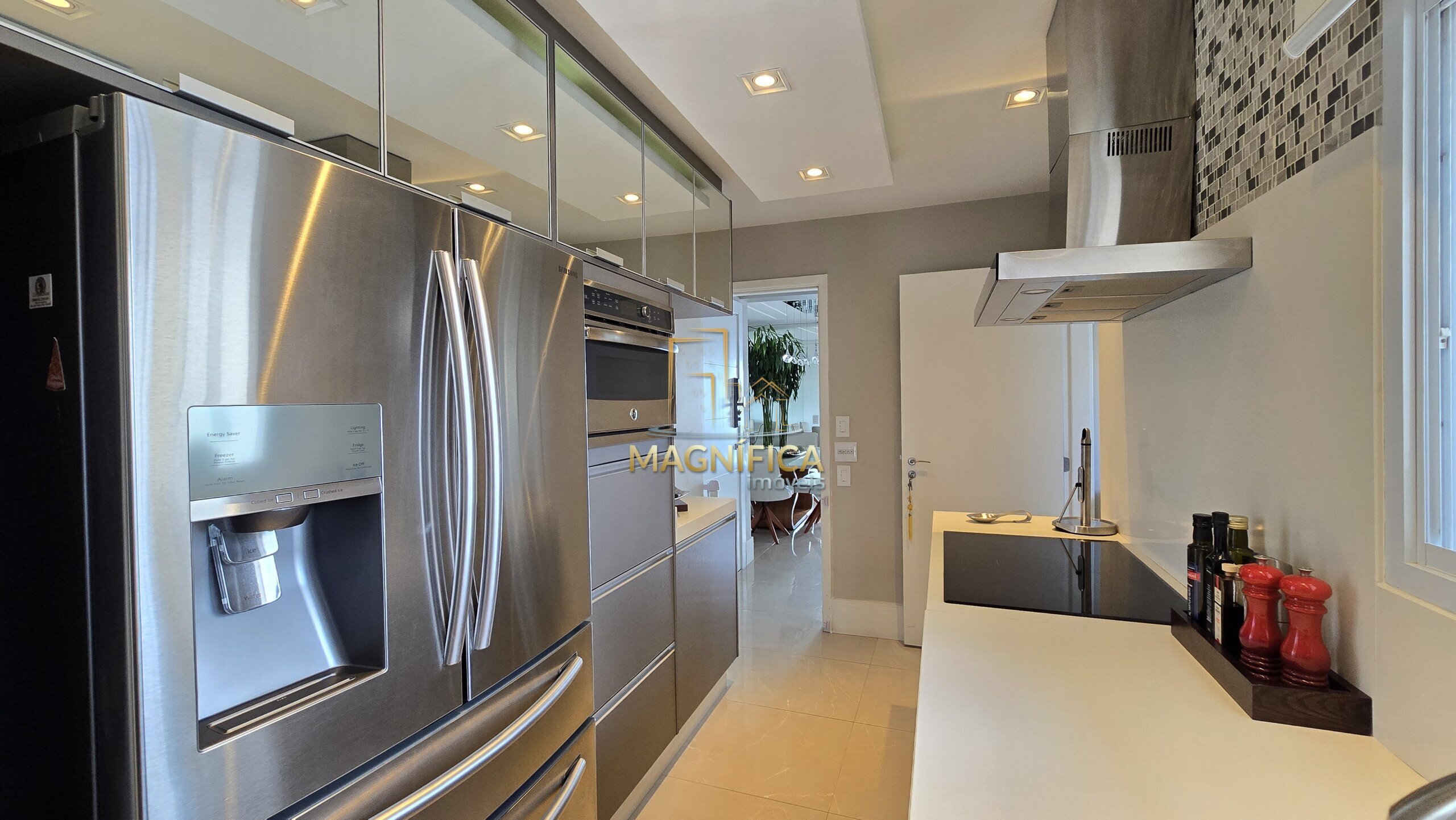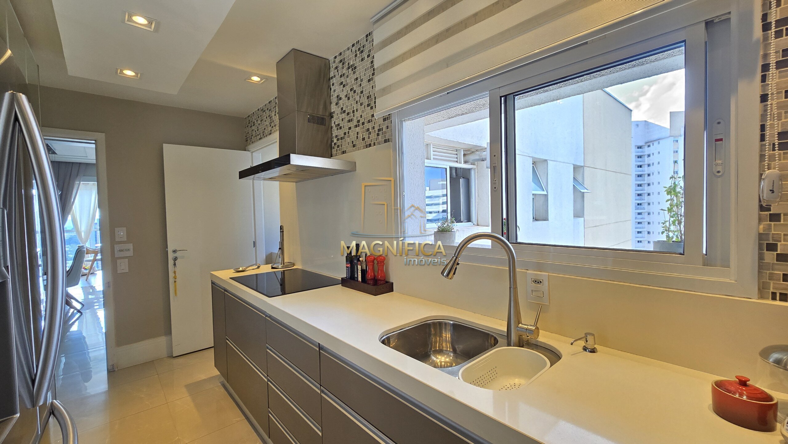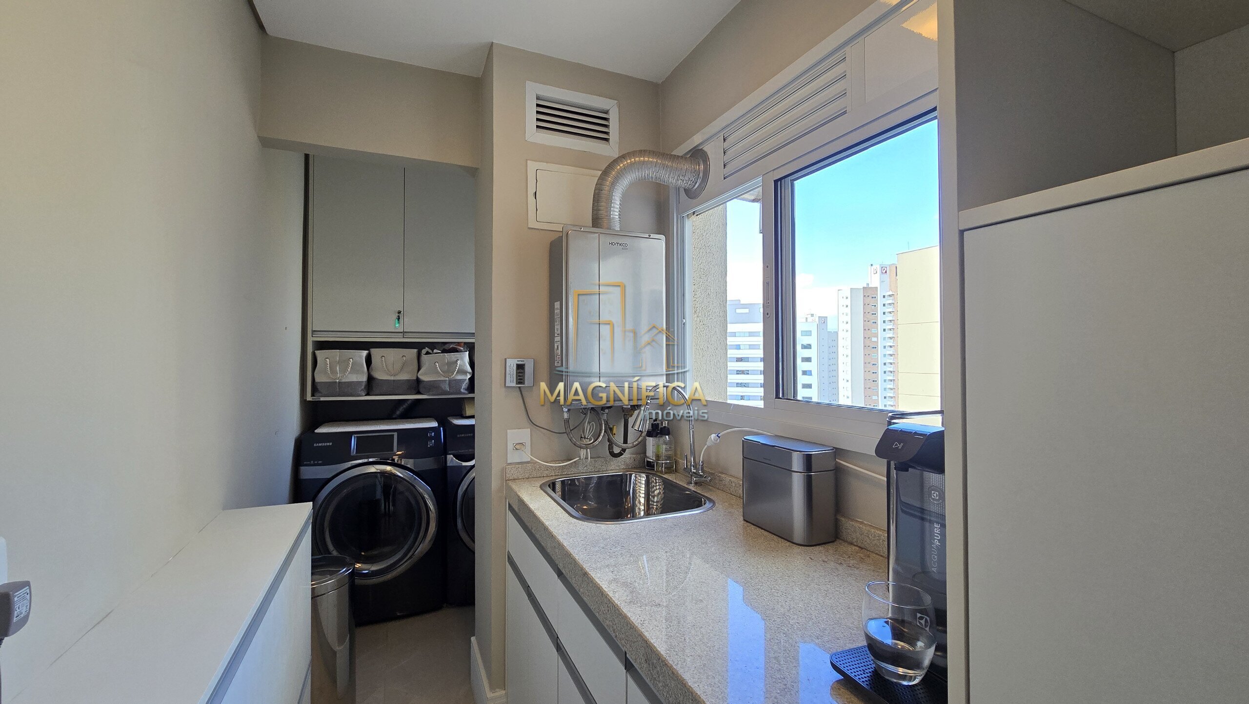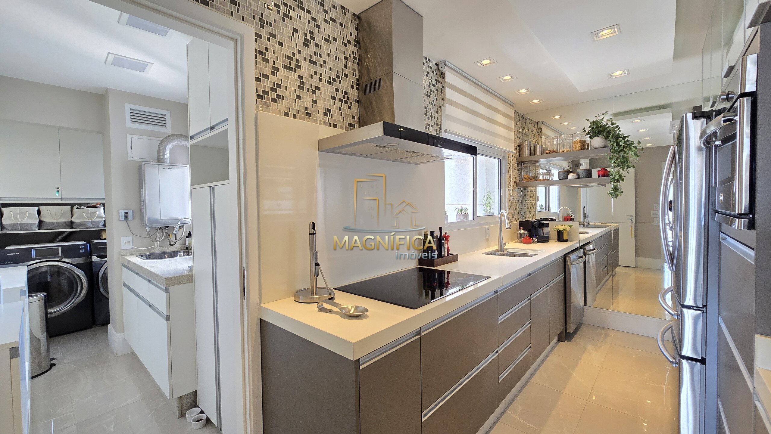 A cozinha é espaçosa, planejada com muito bom gosto e integrada à lavanderia, oferecendo praticidade no dia a dia.