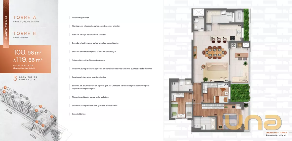 Apartamento com 111,17m² privativos, 3 quartos (sendo 1 suíte), sala para 2 ambientes, sacada gourmet e persianas integradas nos dormitórios.
