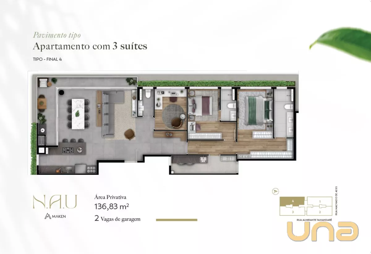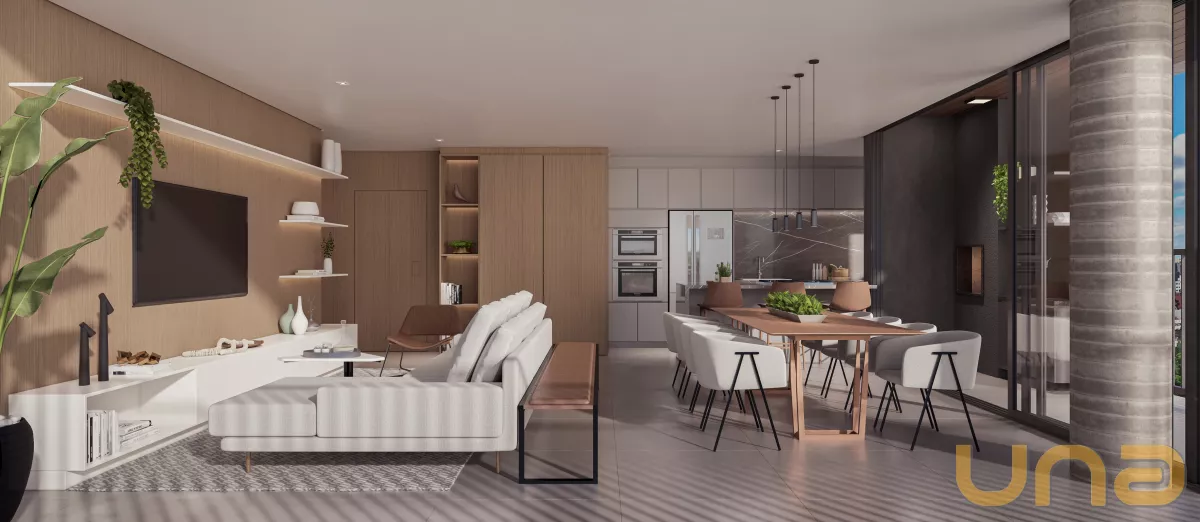 Apartamento com 136,82m² privativos, 3 suítes, ampla sala para 2 ambientes, sacada com churrasqueira e 2 vagas de garagem.
