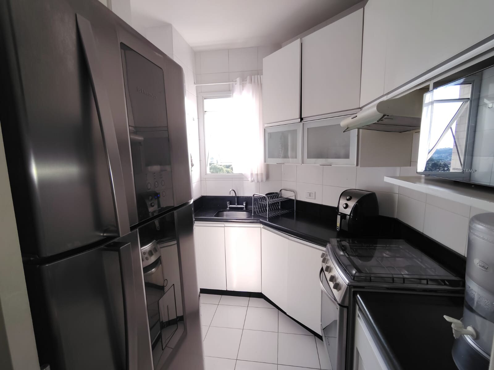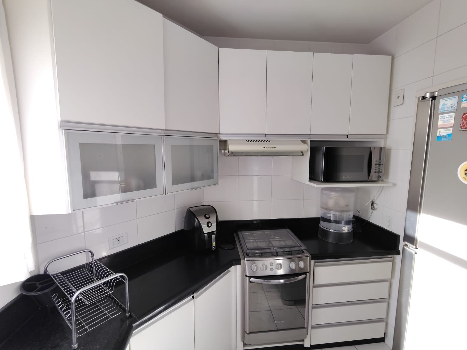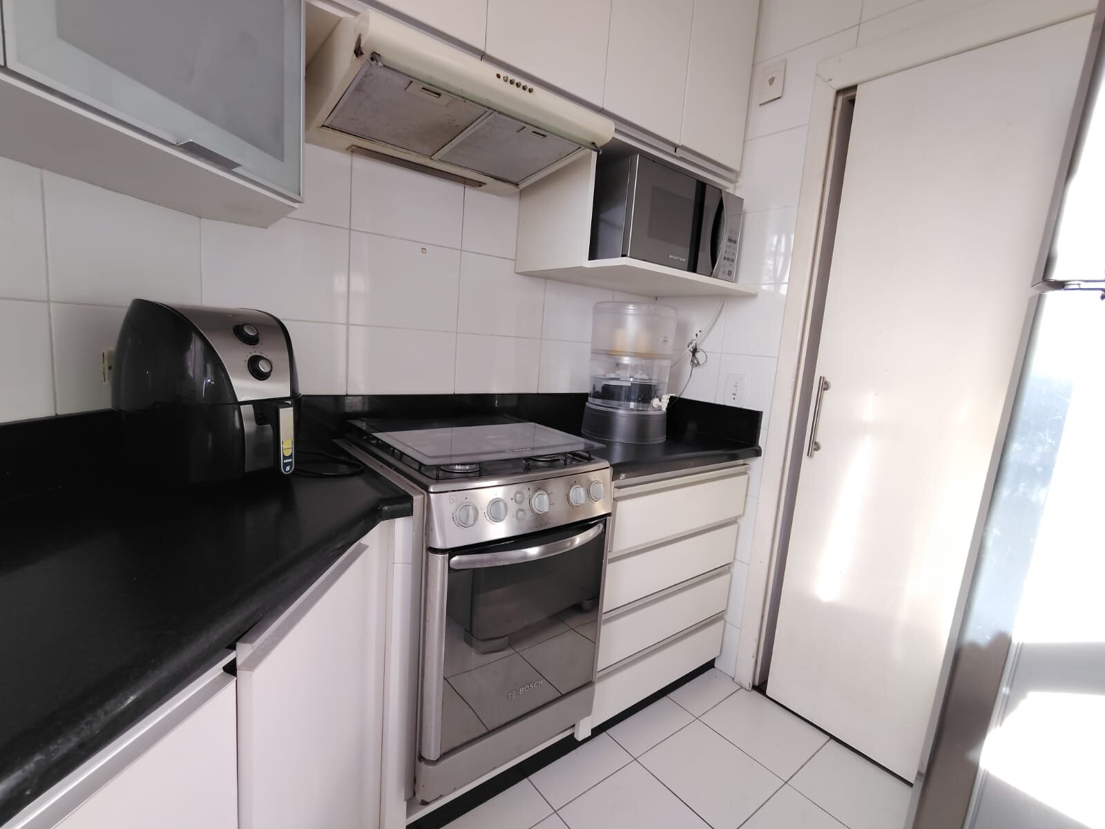 • Cozinha planejada com armários sob medida e bancada em granito, combinando praticidade e elegância;