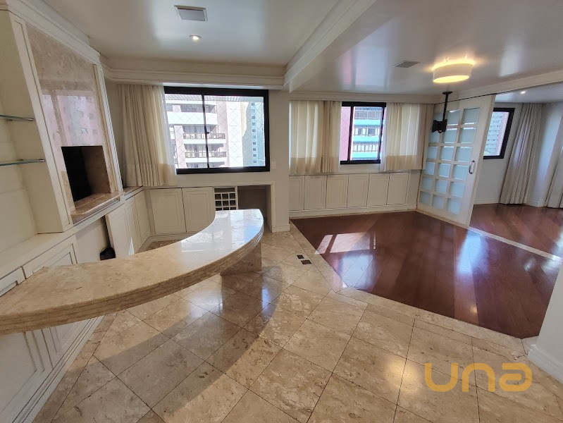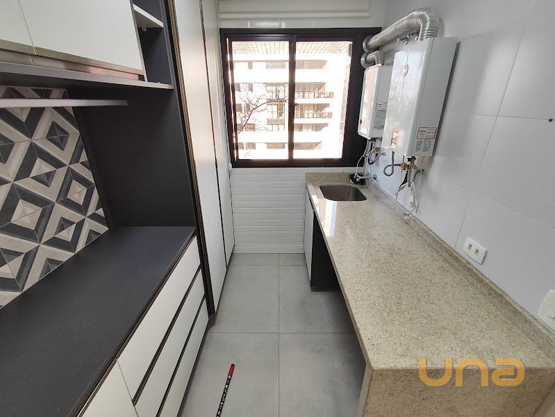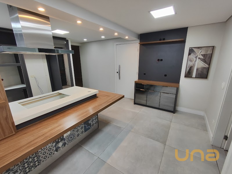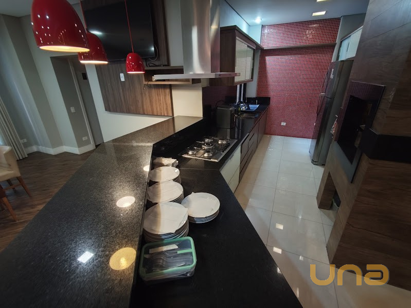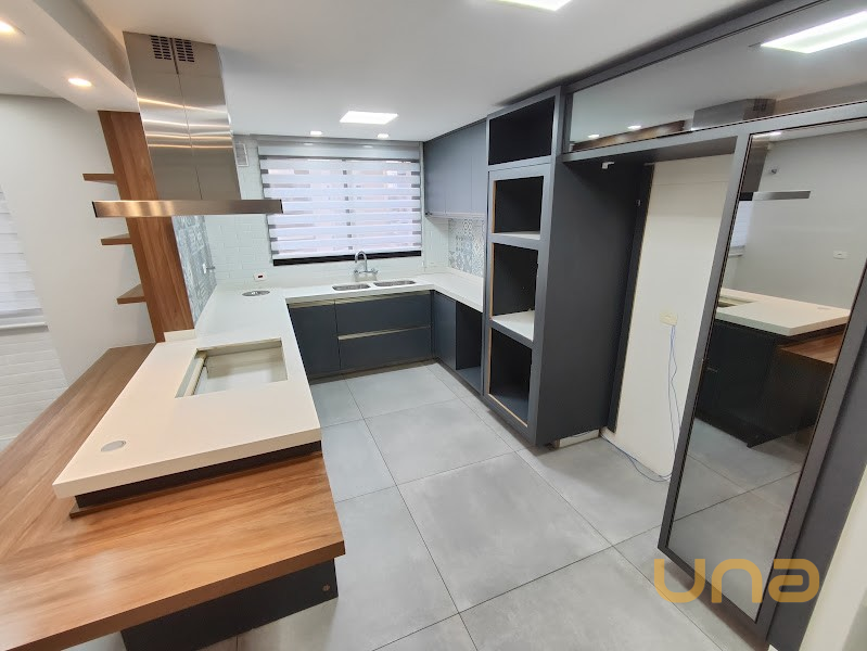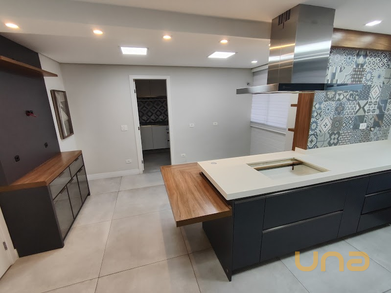 - Cozinha americana com armários planejados, tampos em granito, exaustor, iluminação em led, área anexa para refeições