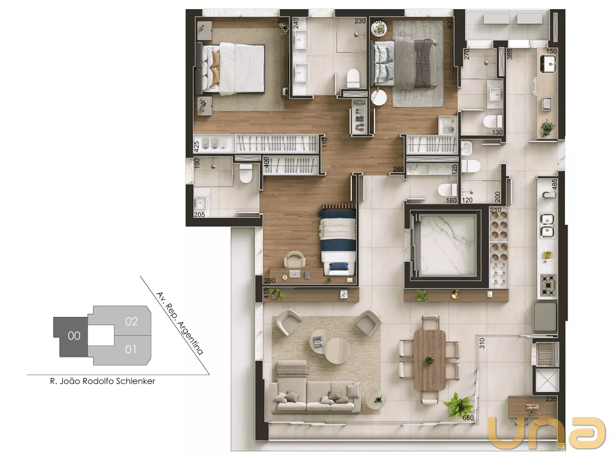 Apartamento com 3 suítes, 141m² privativos, sacada com churrasqueira, sala ampla para 2 ambientes e 2 vagas de garagem, próxima aos melhores pontos comerciais, culturais e gastronômicos de Curitiba.