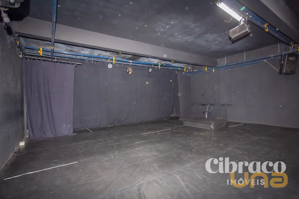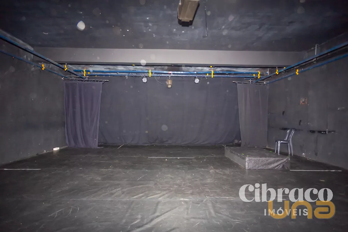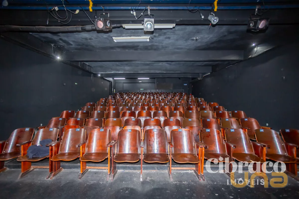 Teatro com 150 lugares, camarim e 2 banheiros e mais 2 banheiros de apoio.