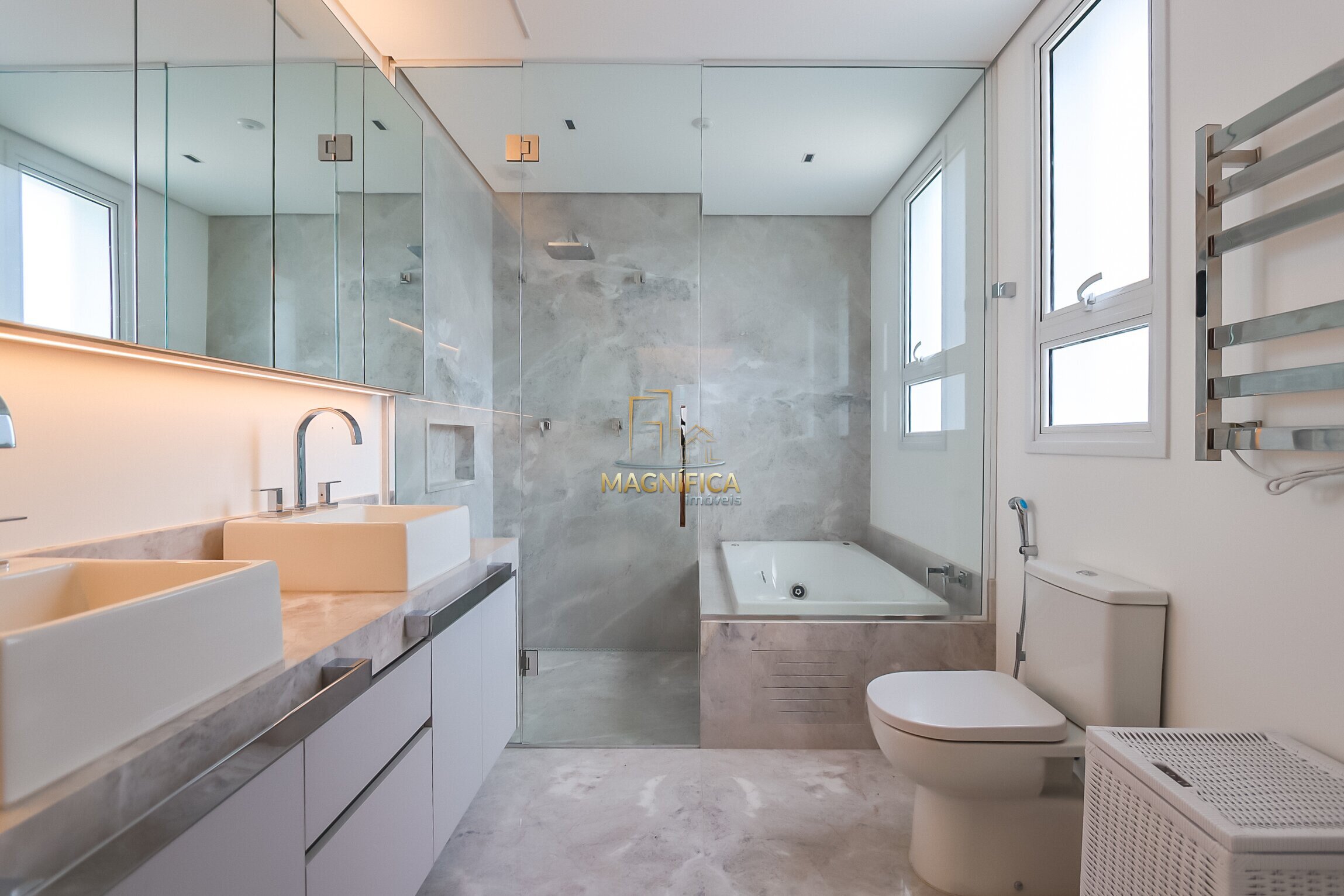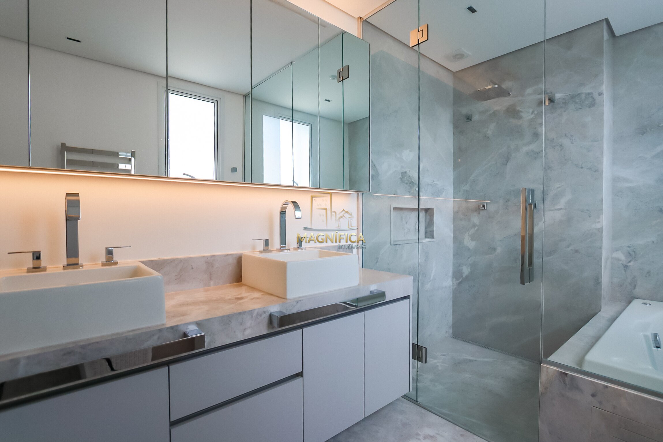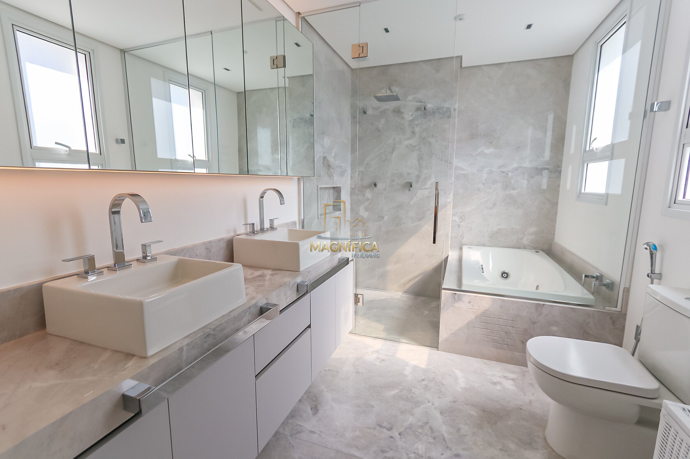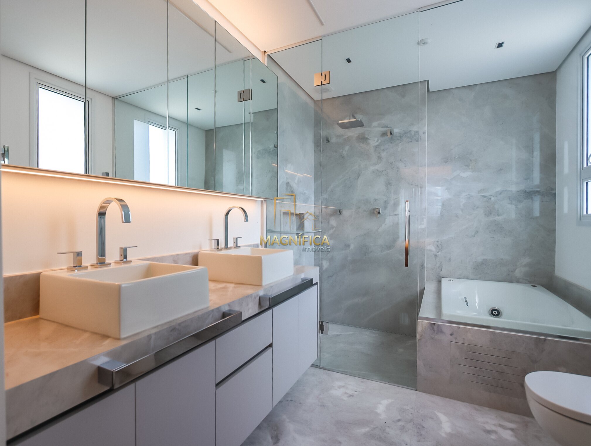 BWC da suíte master com bancada em mármore, cuba dupla (de sobrepor), ducha higiênica e box até o teto