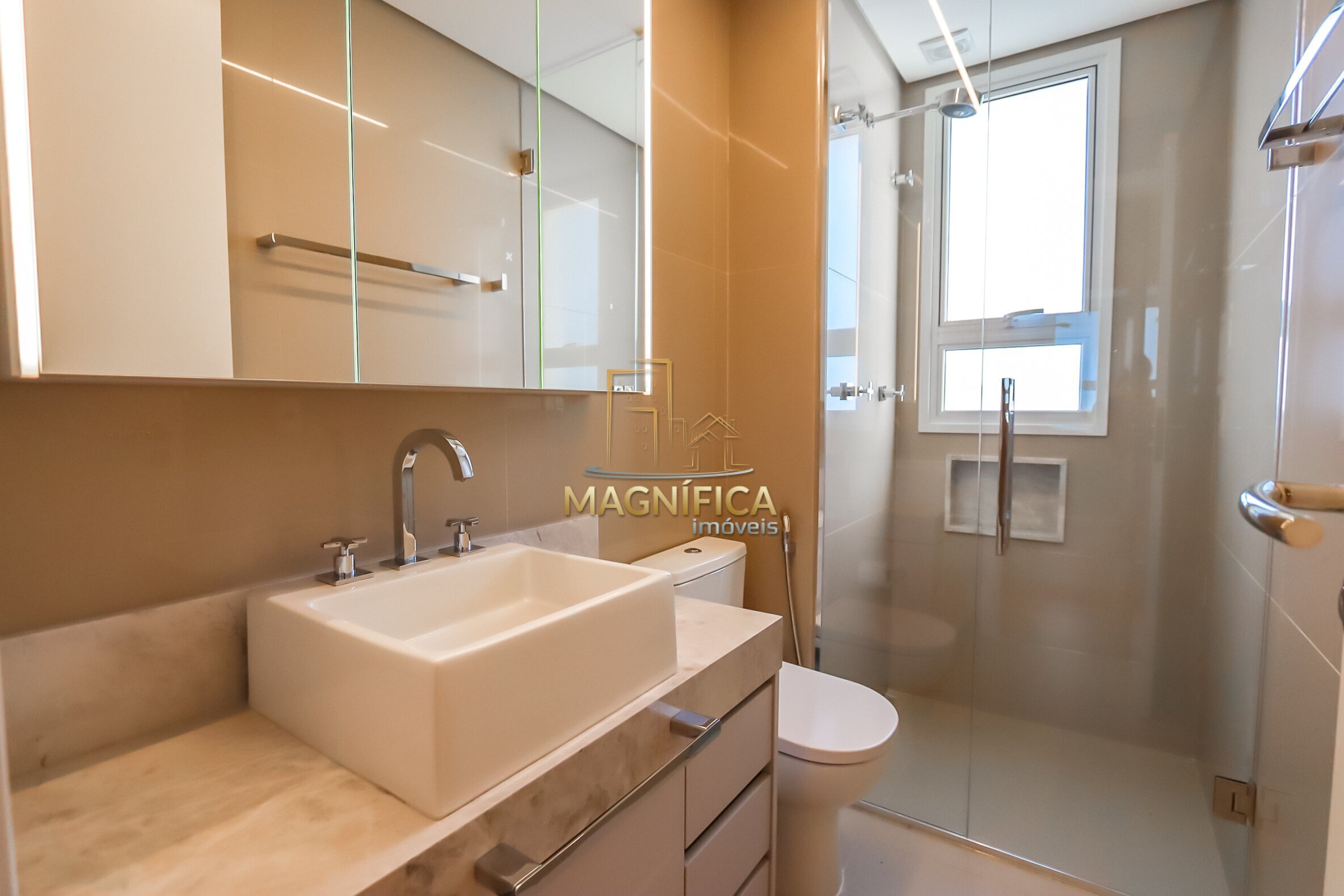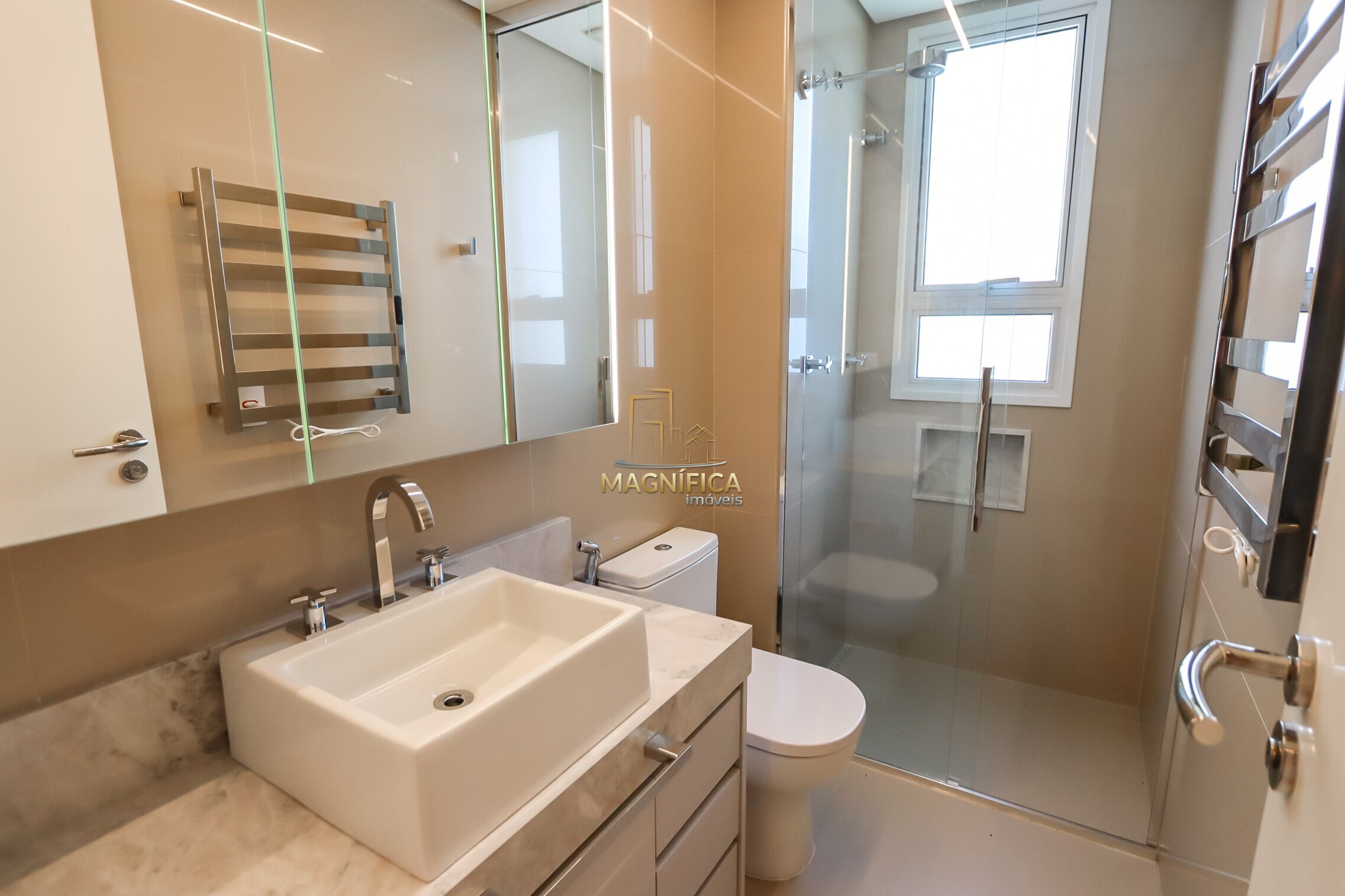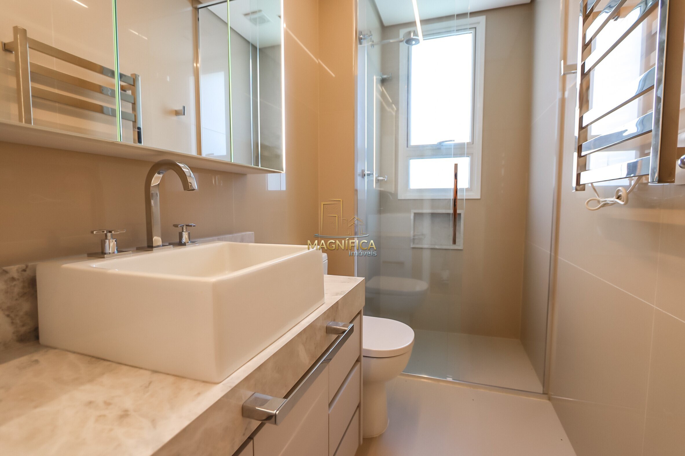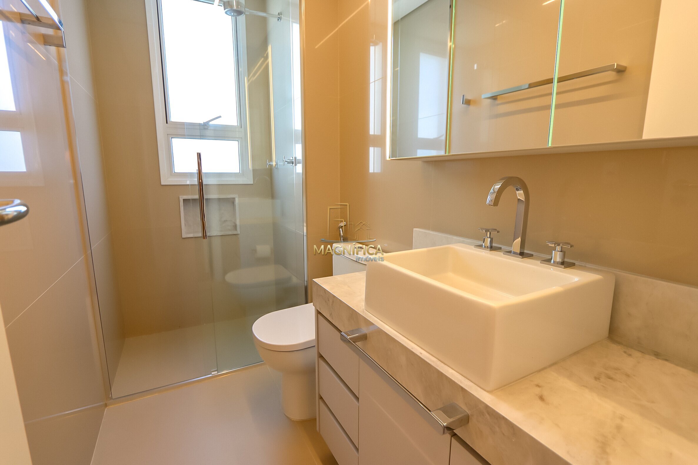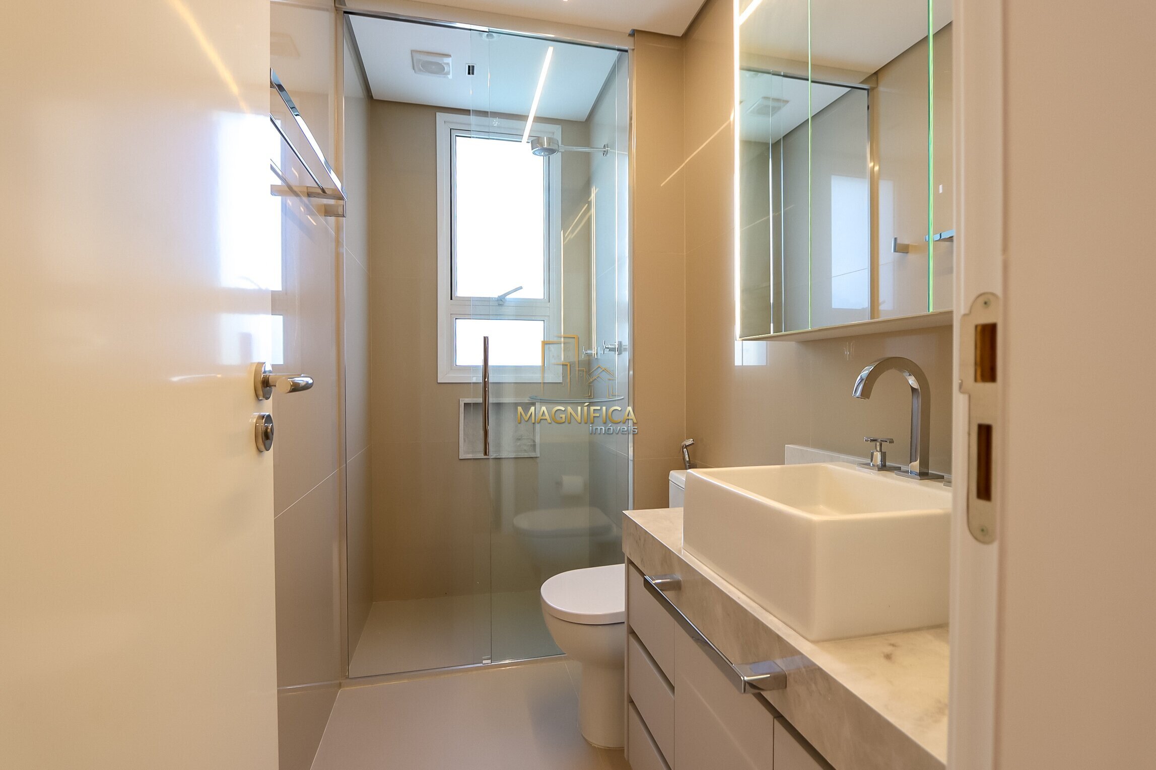 BWC da suíte master com bancada em mármore, cuba dupla (de sobrepor), ducha higiênica e box até o teto
