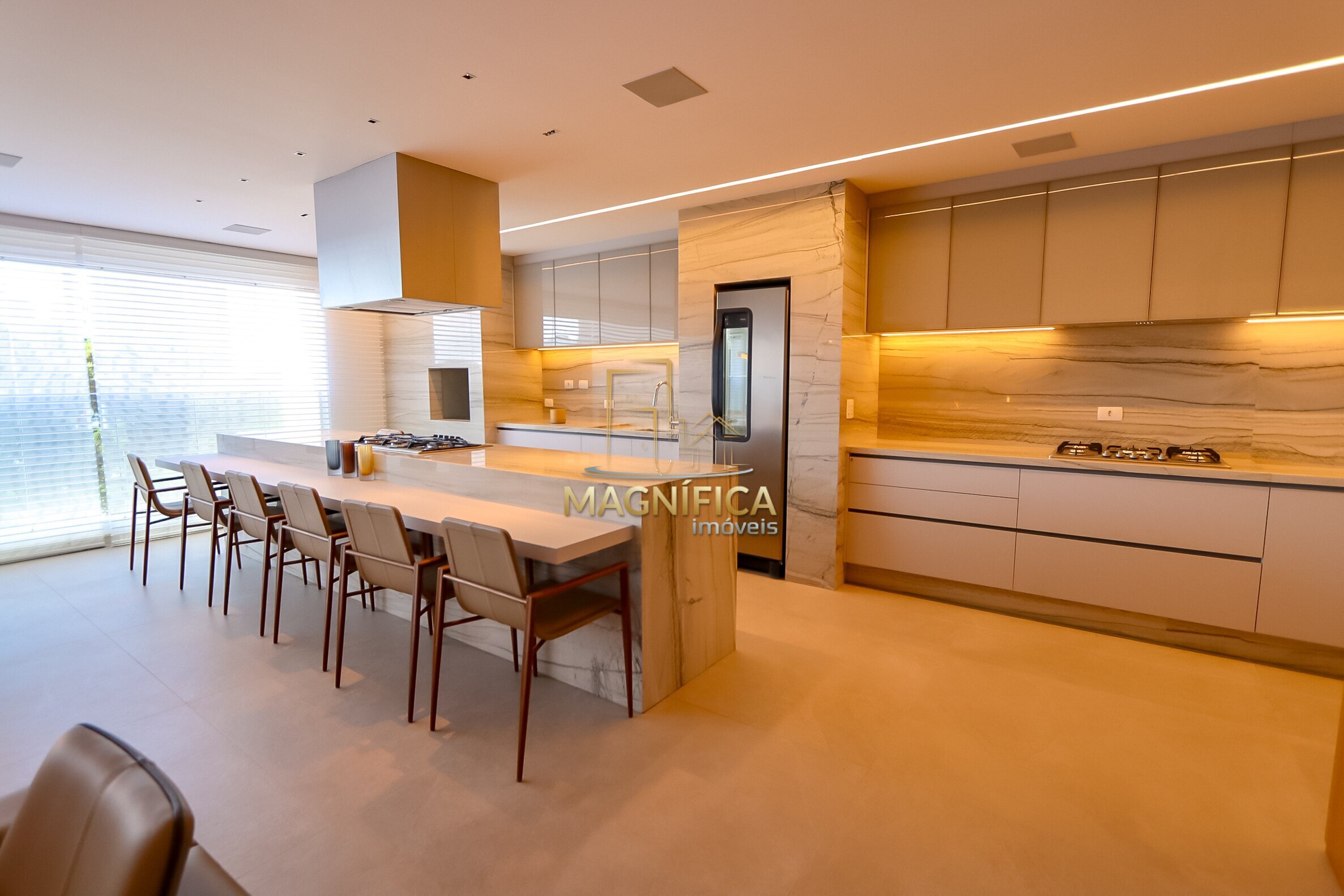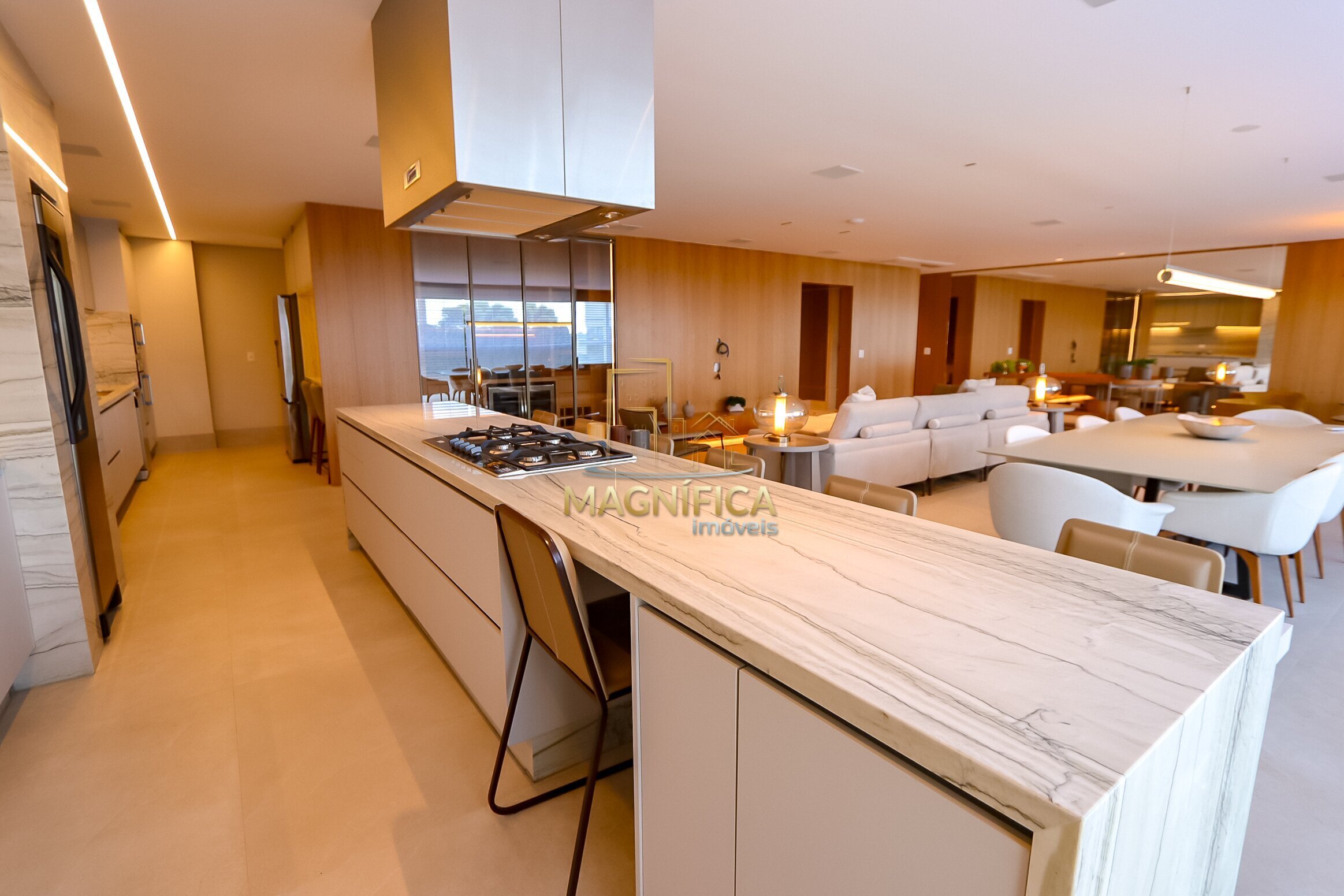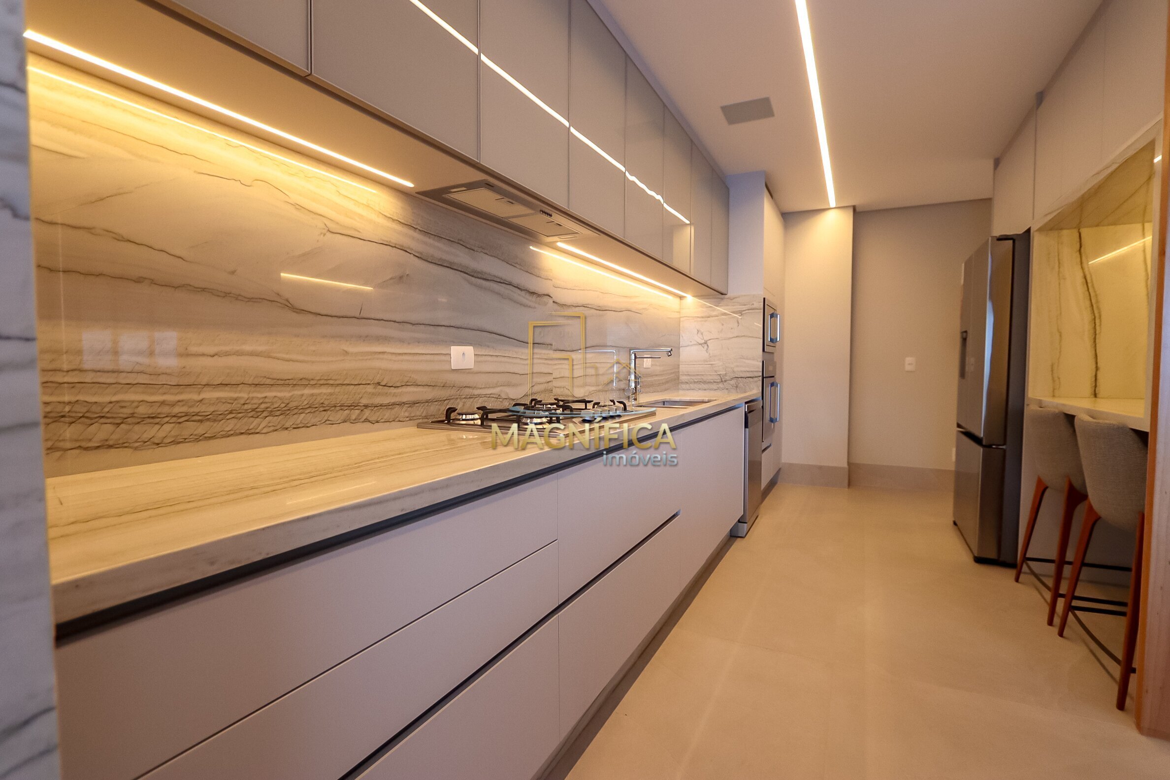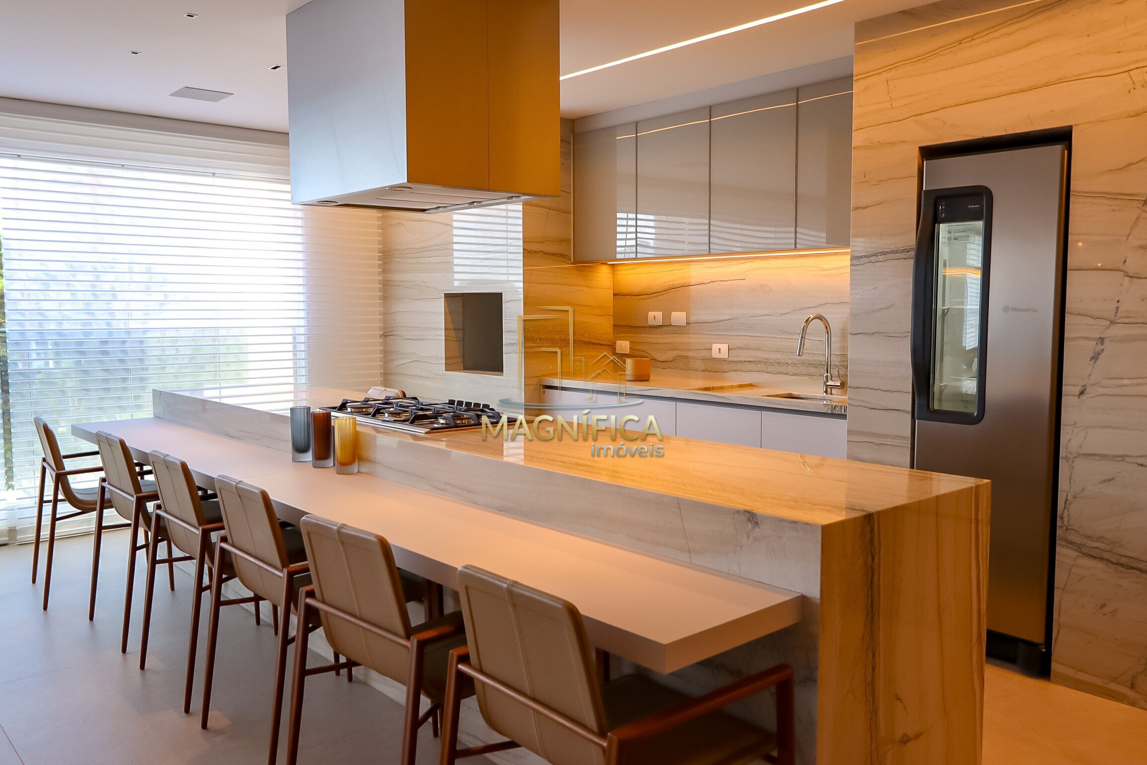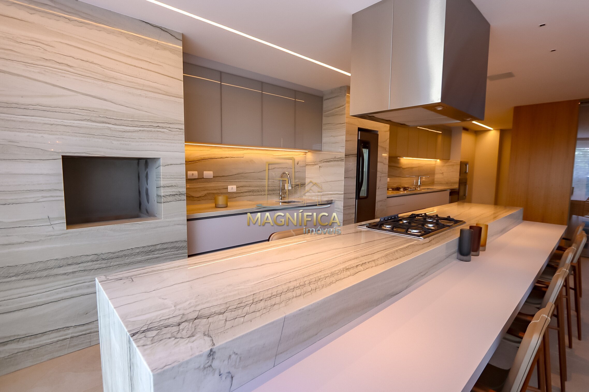 Cozinha ampla com bancadas em mármore, marcenaria planejada e integração com área gourmet