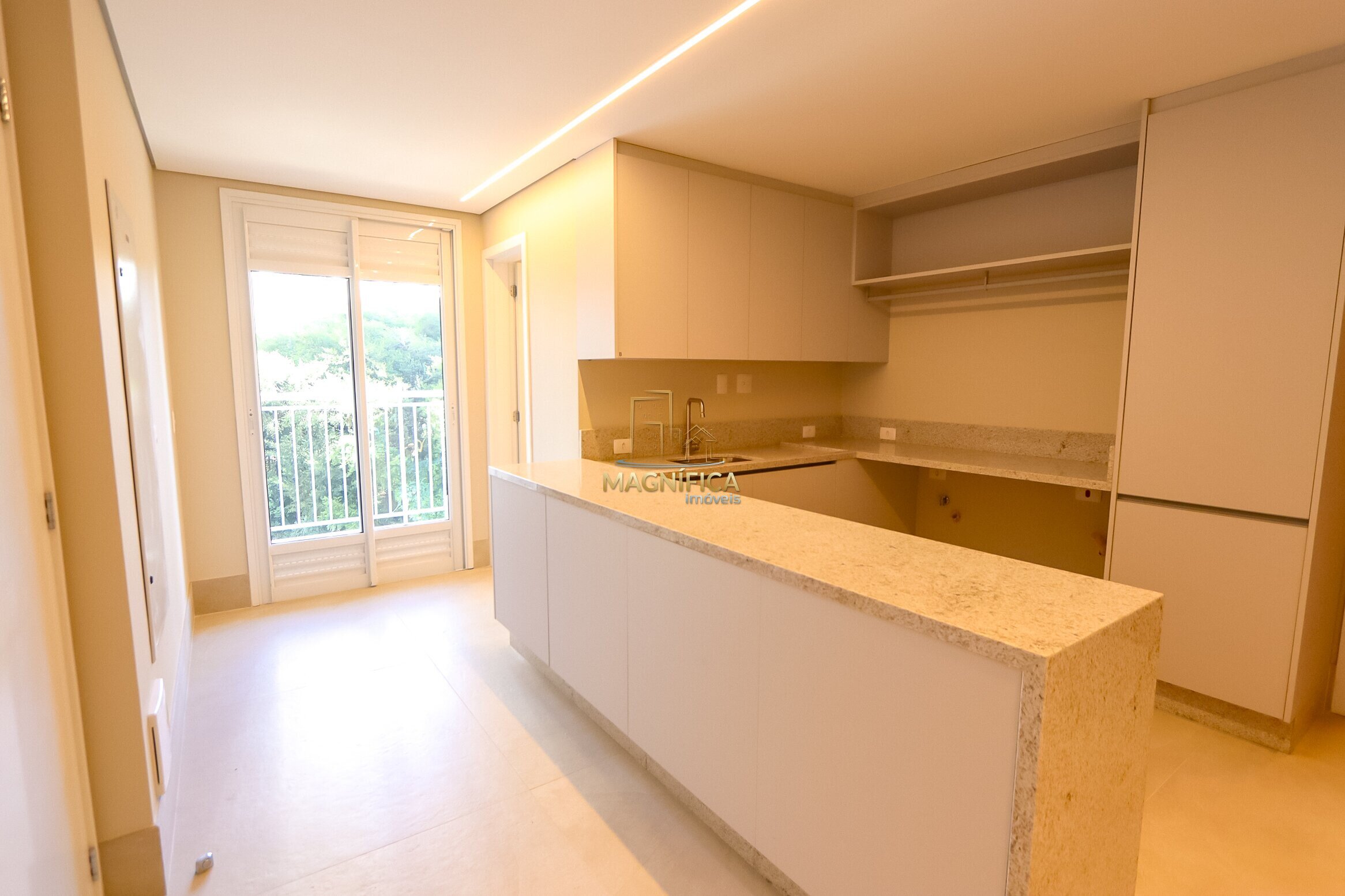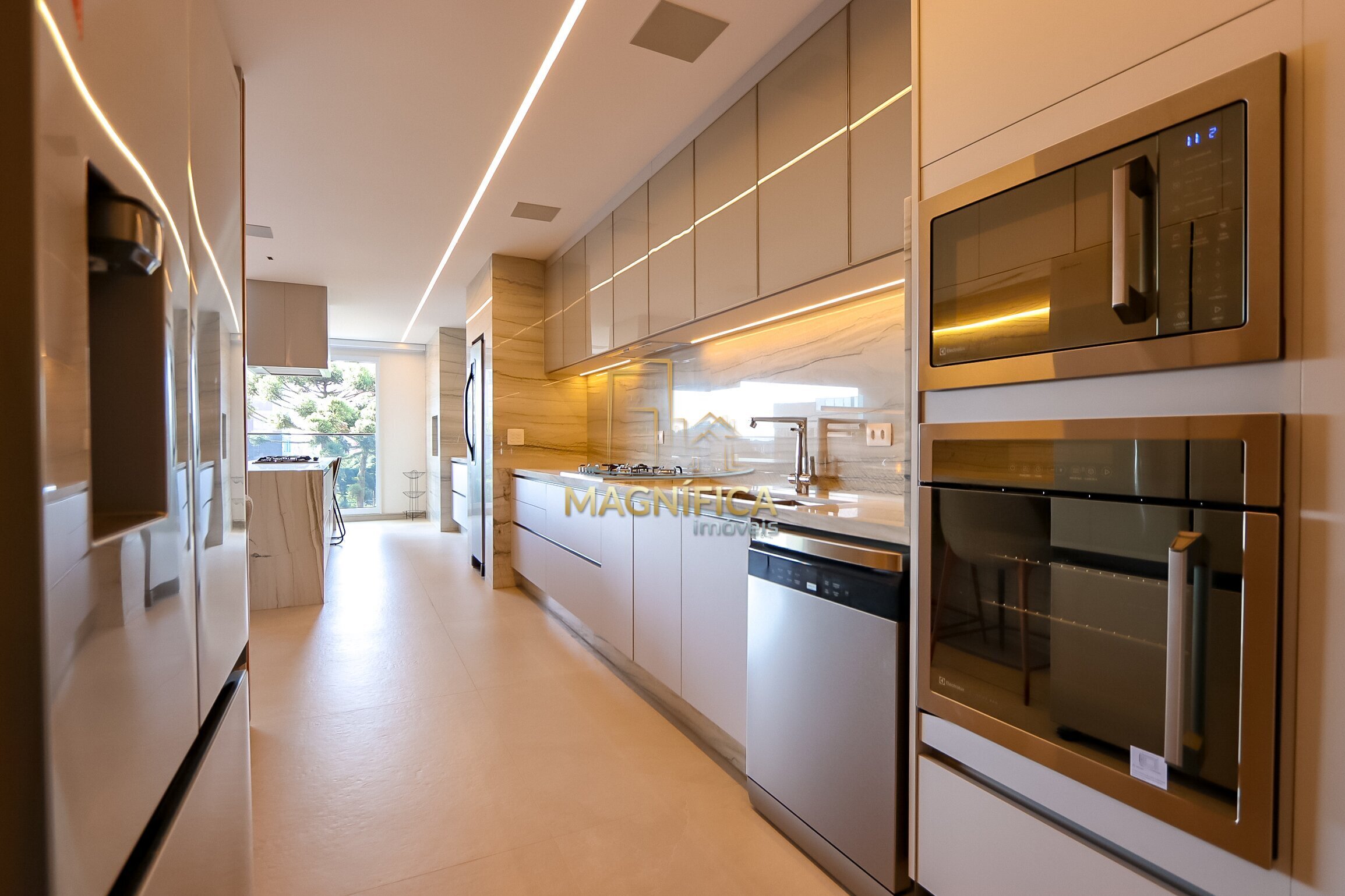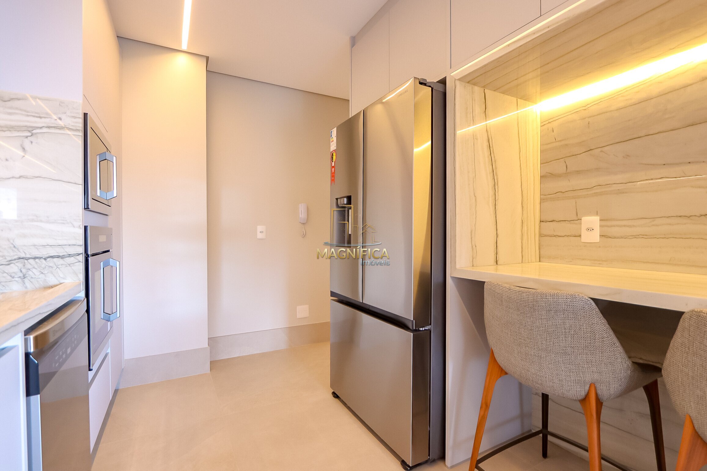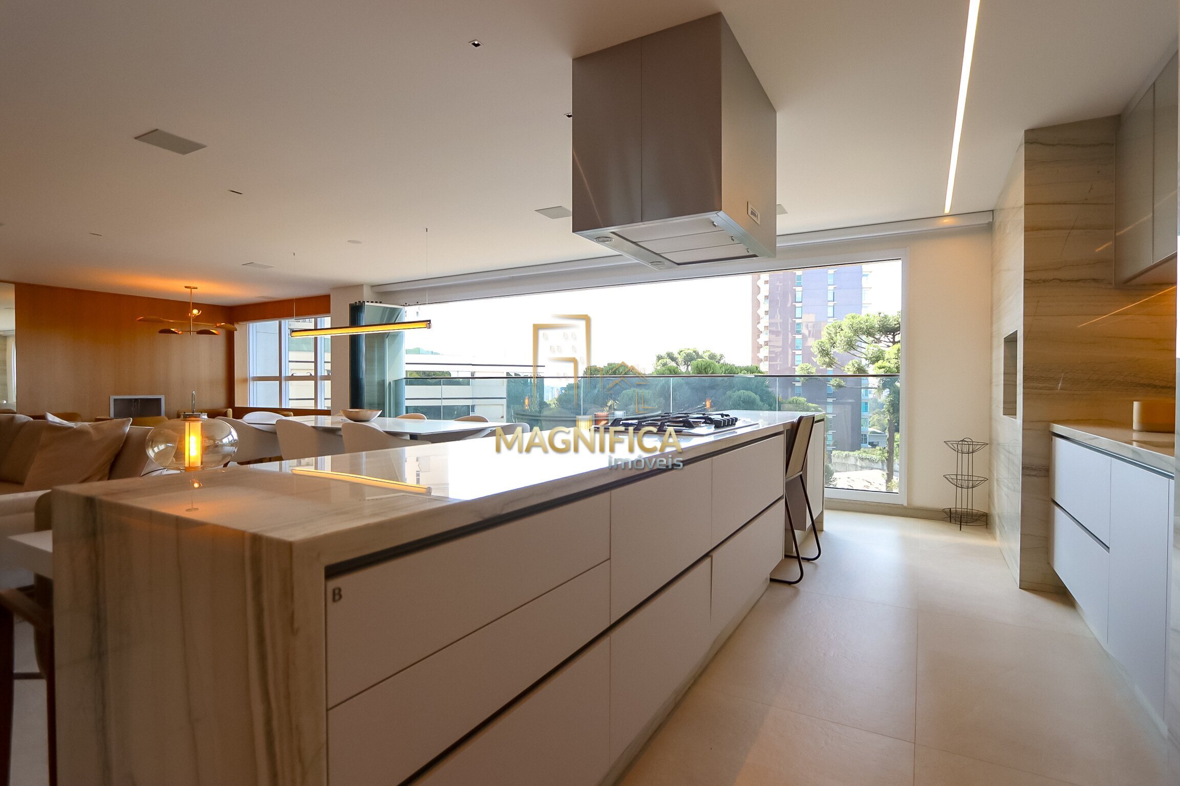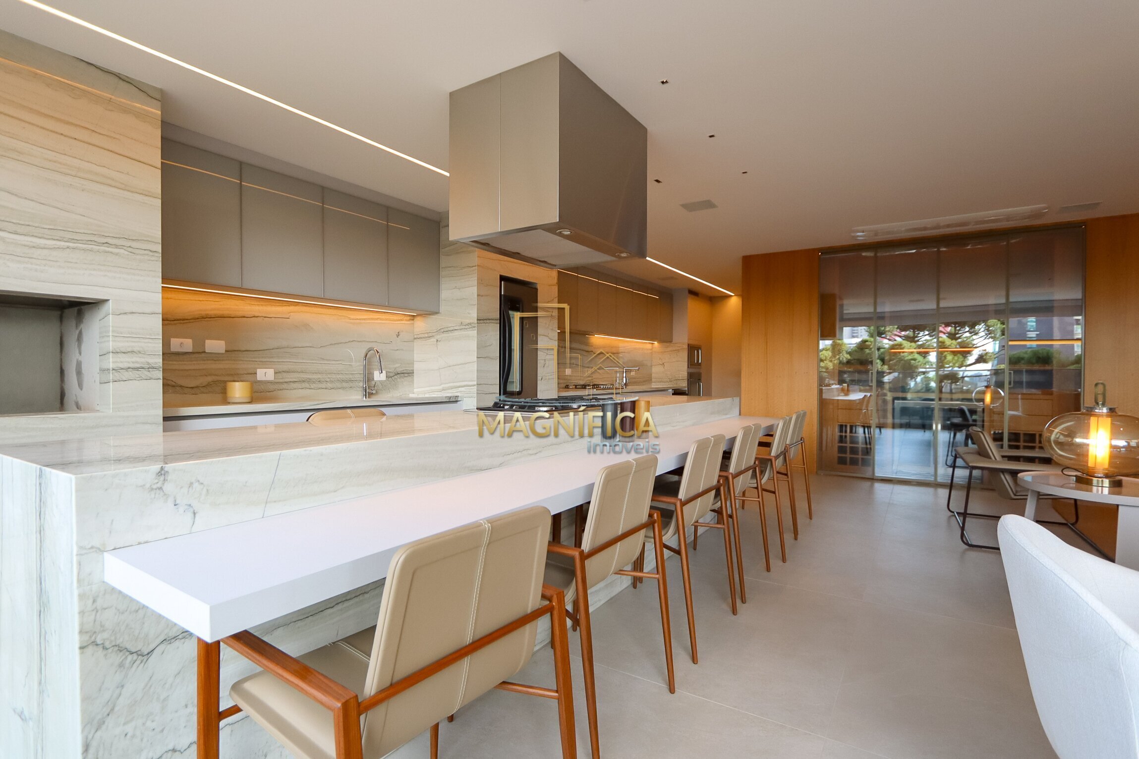 Cozinha ampla com bancadas em mármore, marcenaria planejada e integração com área gourmet