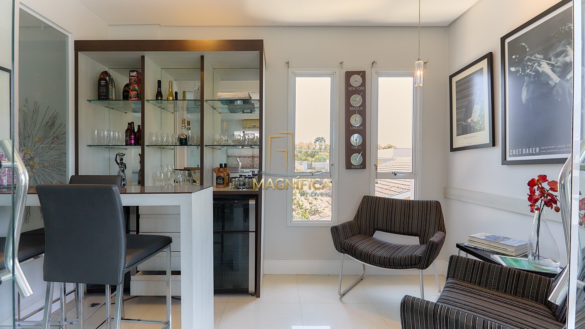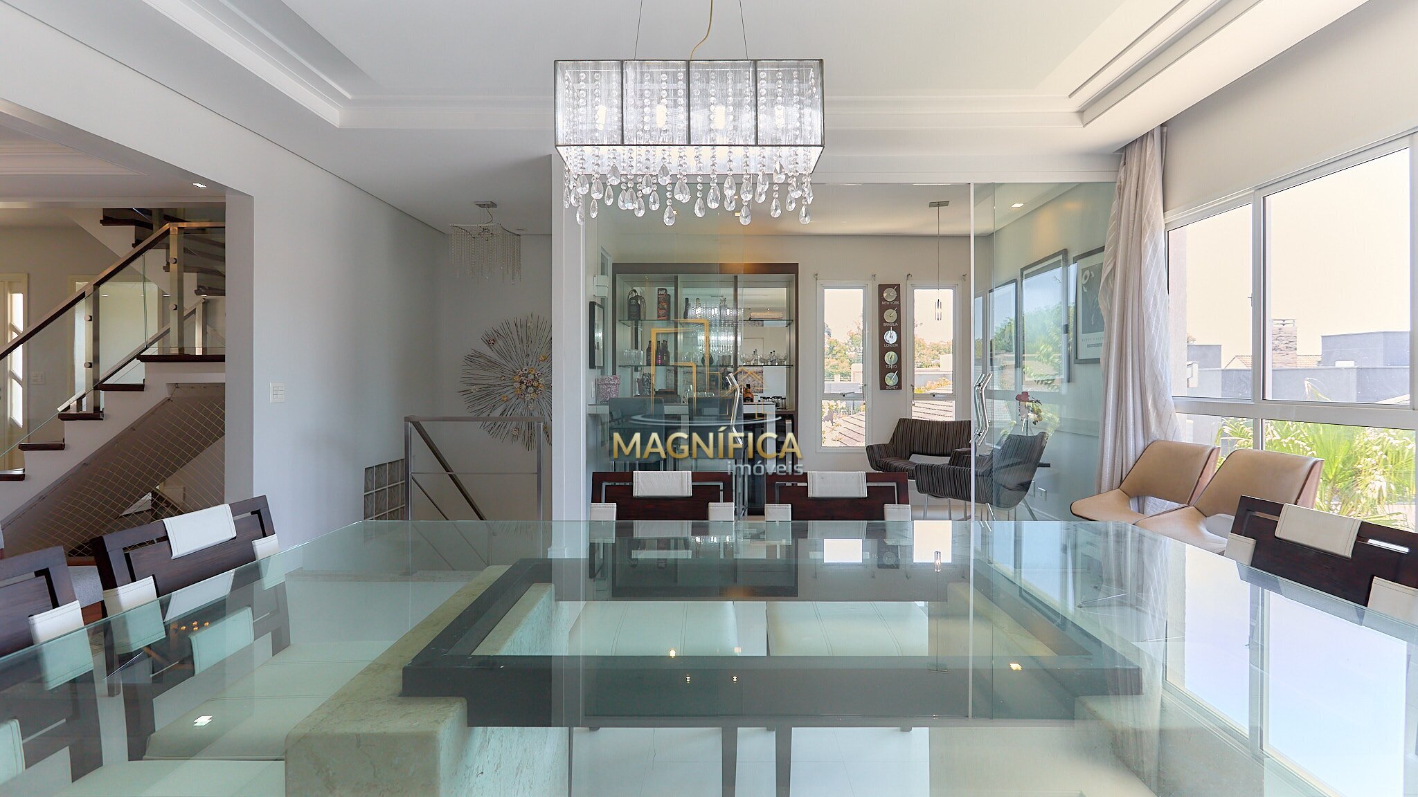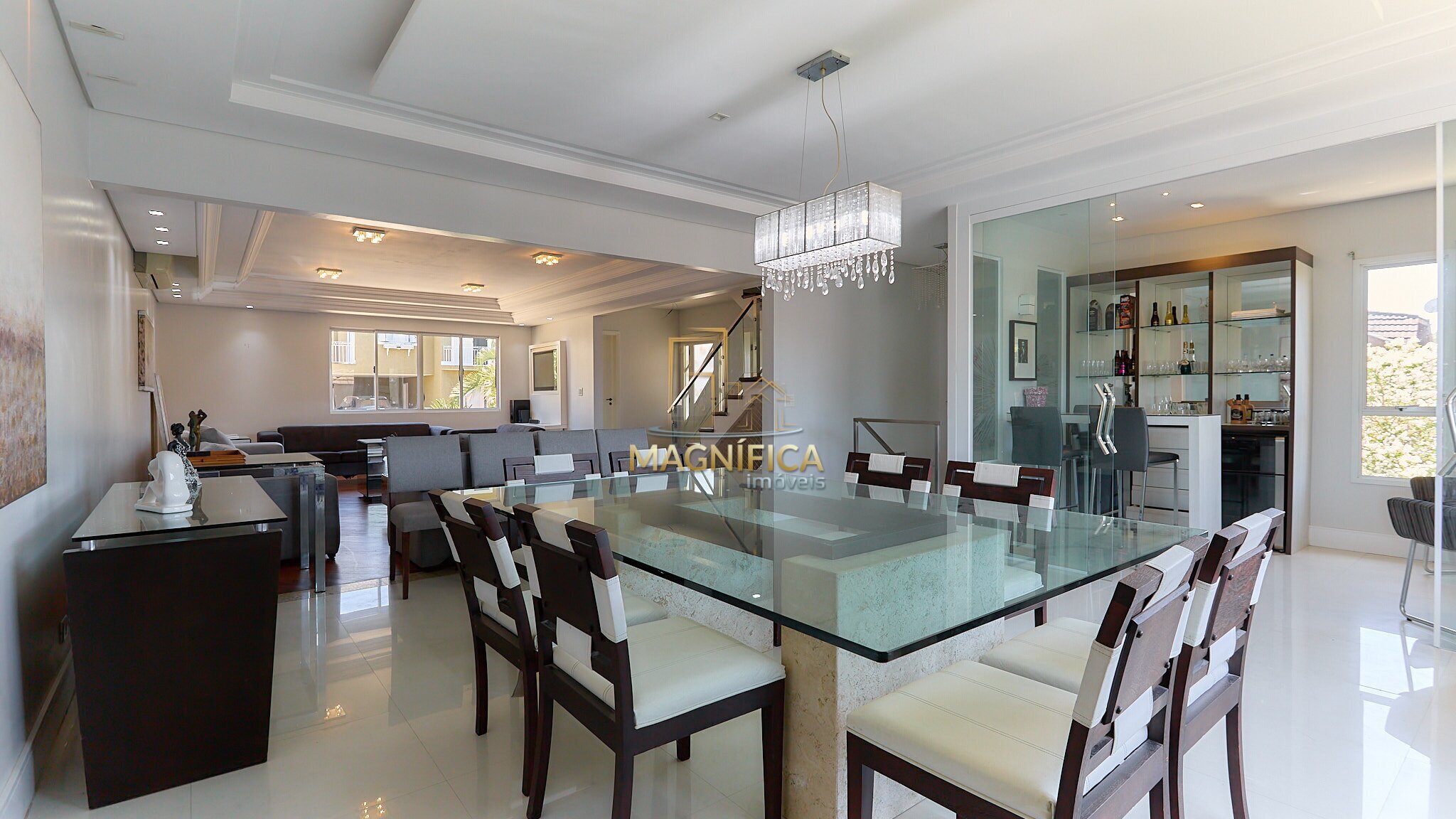 Hall de entrada, lavabo e ampla área social composta por salas de estar e jantar. Ambiente separado para bar/adega com fechamento em vidro, além de copa integrada à cozinha.
