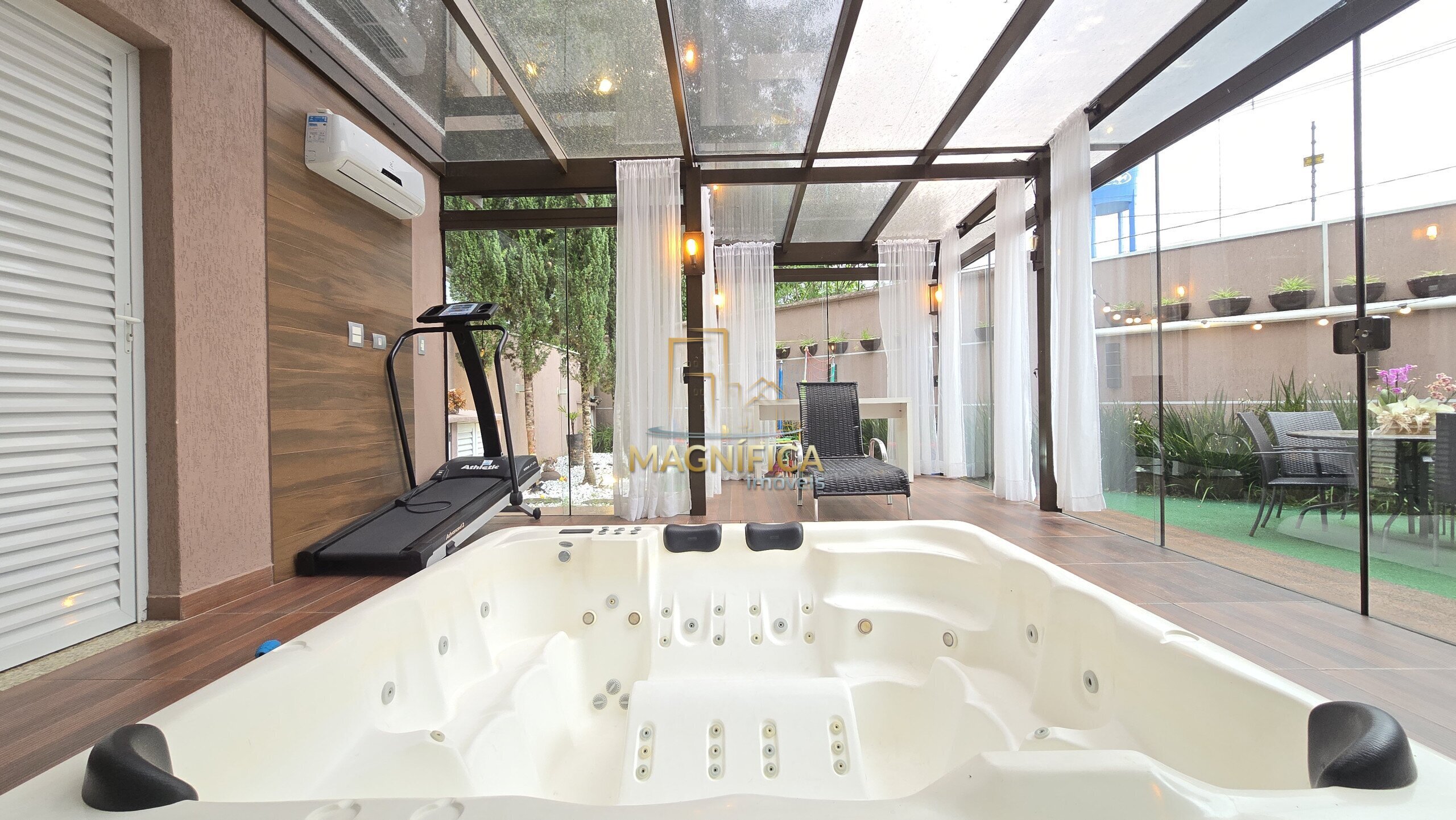 Área externa com hidromassagem coberta para até 12 pessoas e um charmoso jardim que traz aconchego e privacidade.