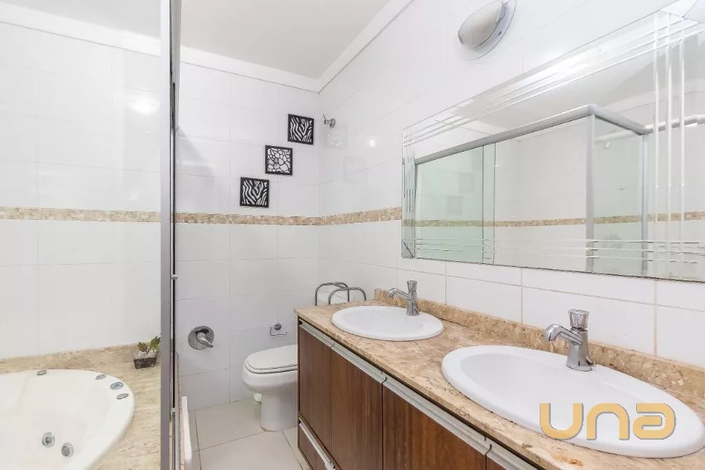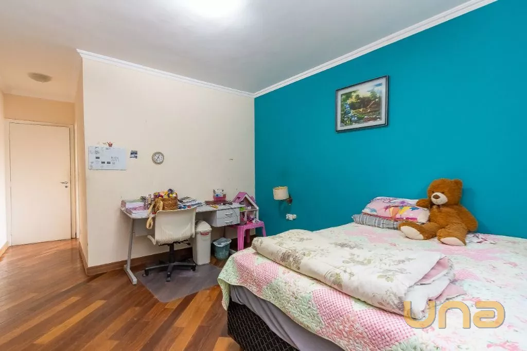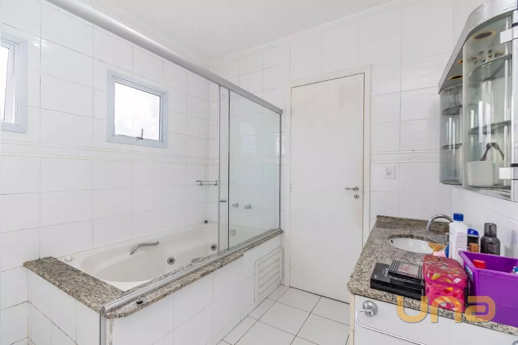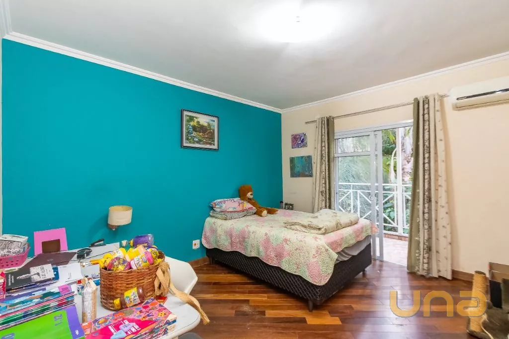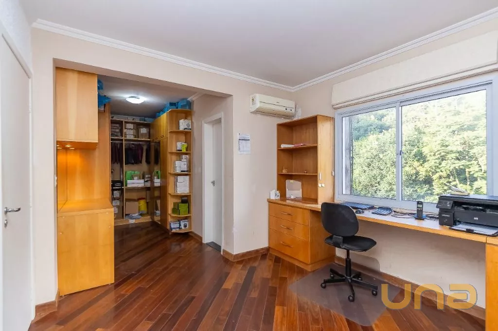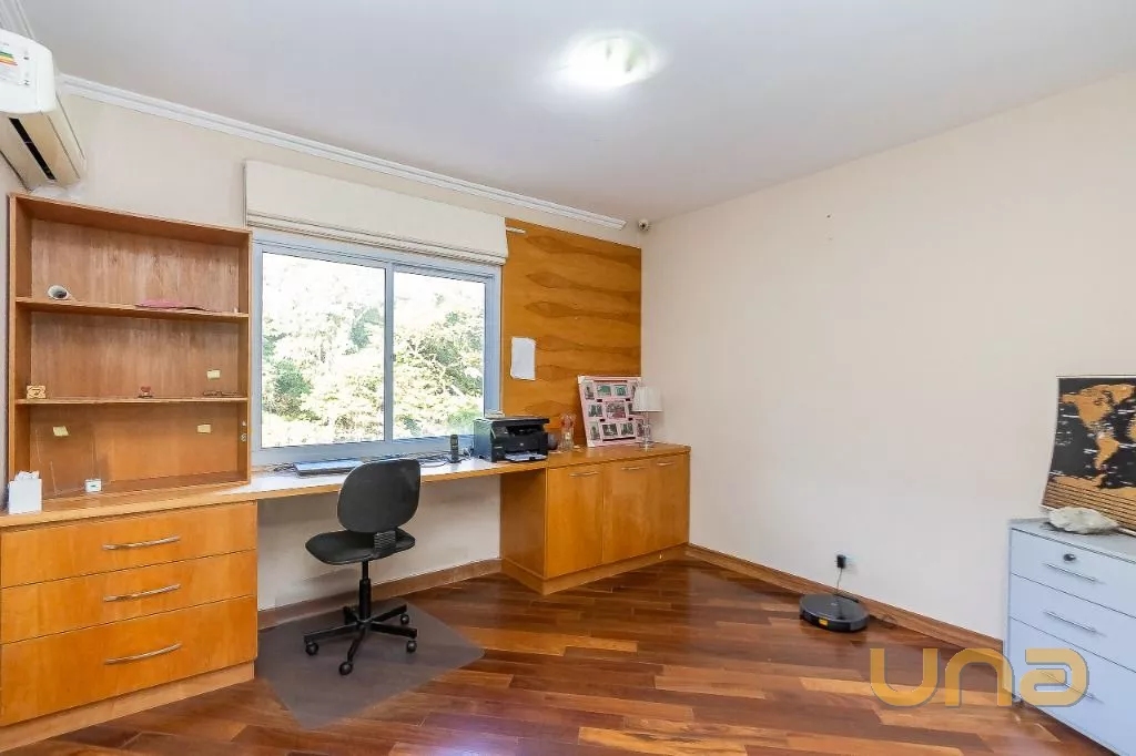 No segundo pavimento, encontram-se as três suítes amplas, sendo duas com closet, banheira de hidromassagem e varanda integrada. A terceira suíte, atualmente utilizada como escritório, possui armários sob medida e excelente iluminação natural. O andar ainda dispõe de uma ante sala e banheiro social.