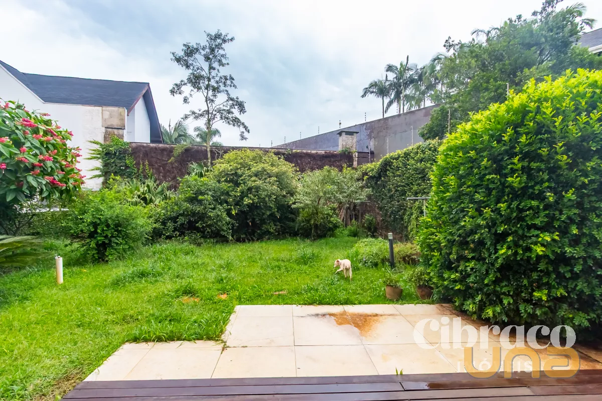 Churrasqueira coberta integrada ao jardim com ótima área ensolarada.