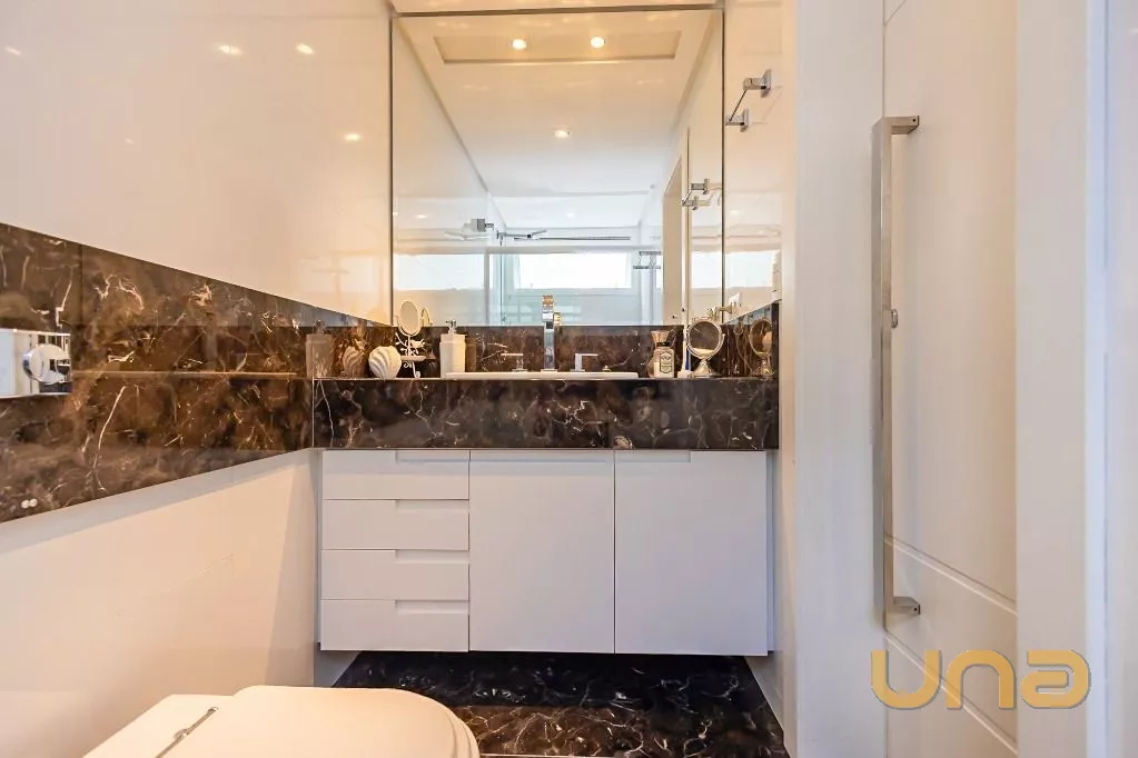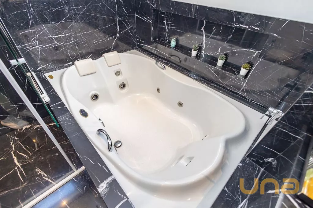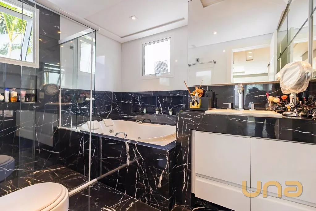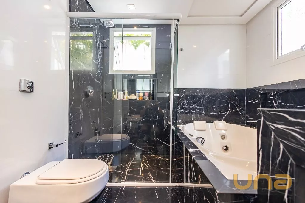 * Banheiro da suíte principal com banheira e mármore nero marchino; suite 2 com silestone italiano branco estrelado; suite 3 com marmore marron imperial italiano,;