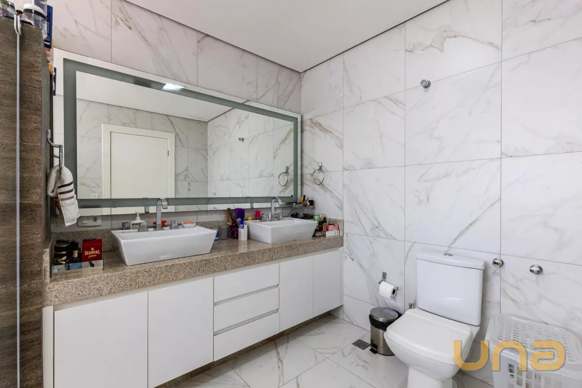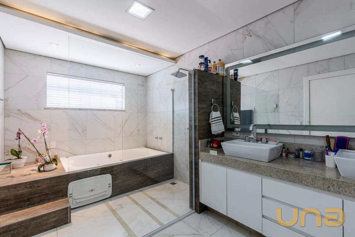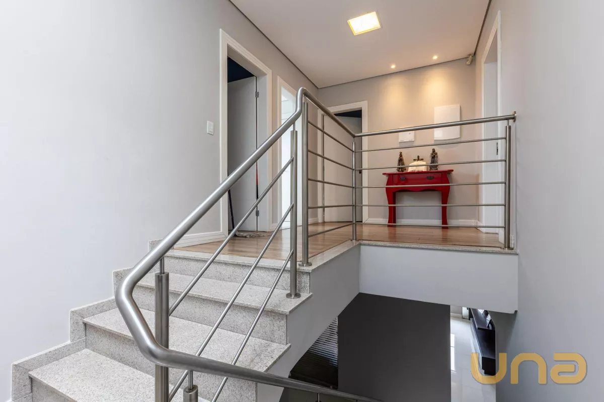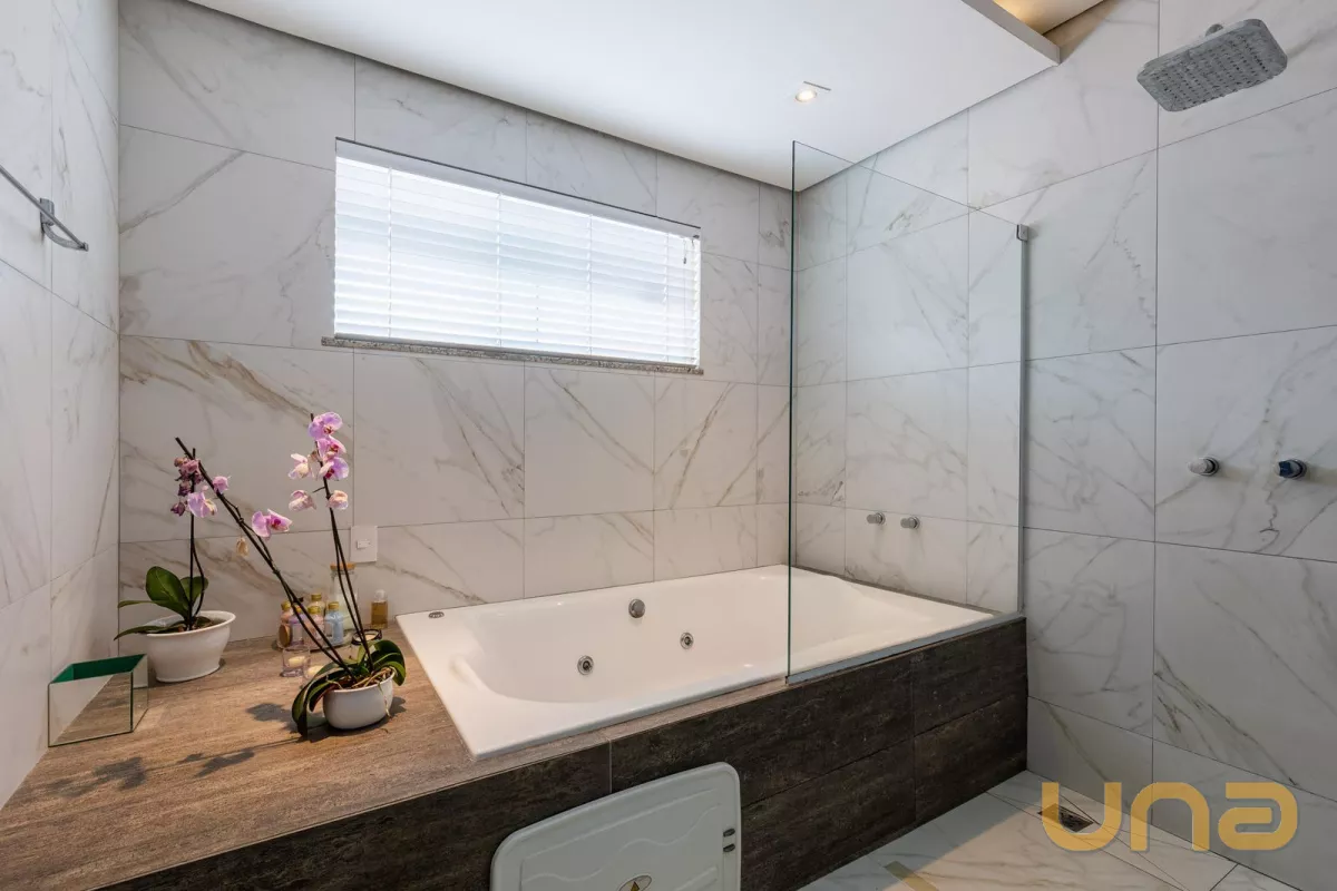 No pavimento superior, a casa conta com um amplo hall e três dormitórios, sendo uma suíte máster com sacada, ar-condicionado, closet com armários planejados e banheiro com hidromassagem. Os outros dois dormitórios também possuem sacadas, armários embutidos e ar-condicionado. O banheiro social tem acesso compartilhado com a suíte. O piso é laminado e as escadas em granito, garantindo sofisticação e durabilidade.