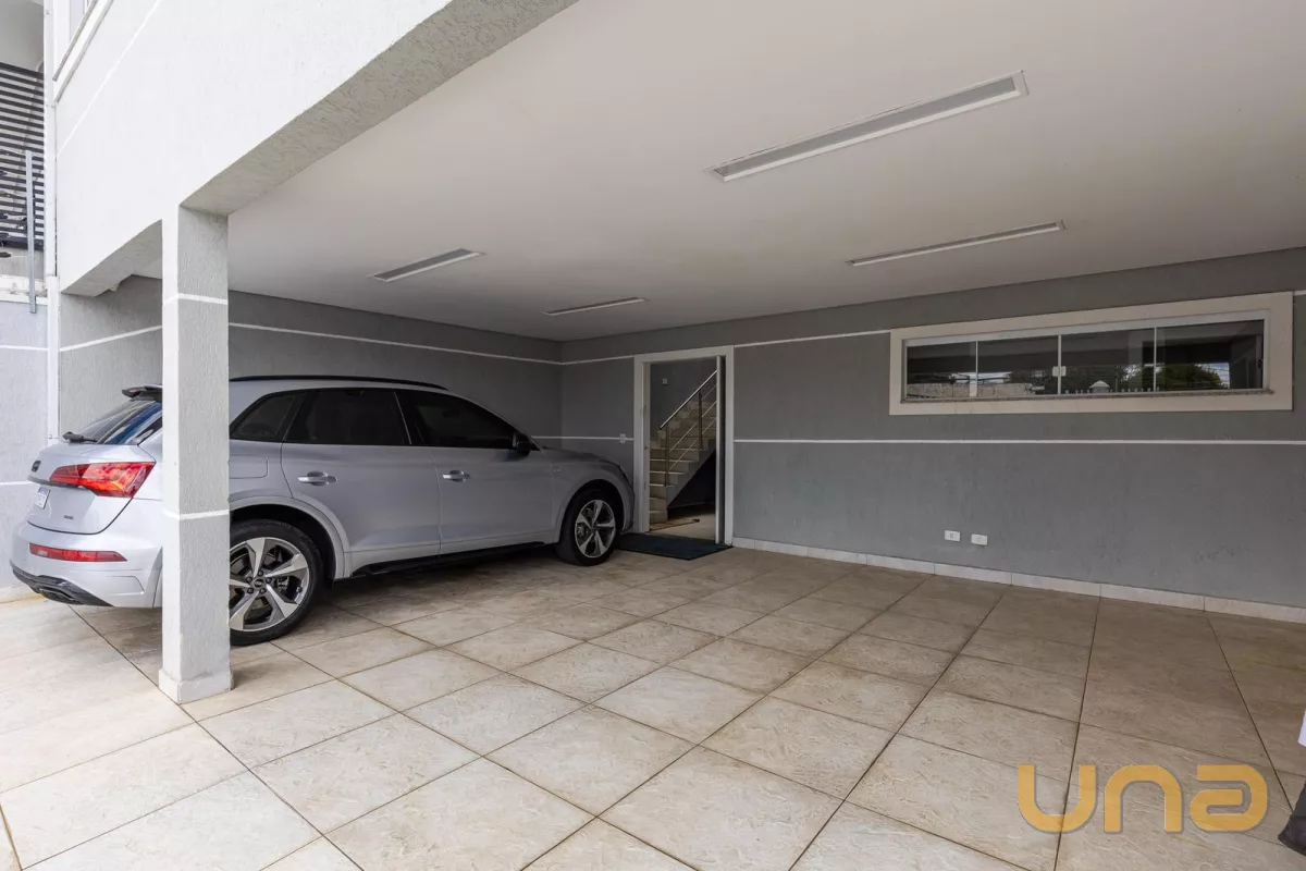 O pavimento térreo dispõe de hall de entrada, lavanderia com armários, bar com adega, pia e bancada em granito, além de um banheiro social. A garagem é coberta para três carros, com vagas adicionais no estacionamento.