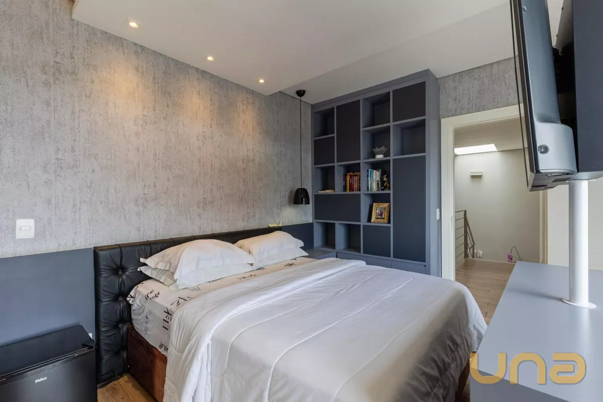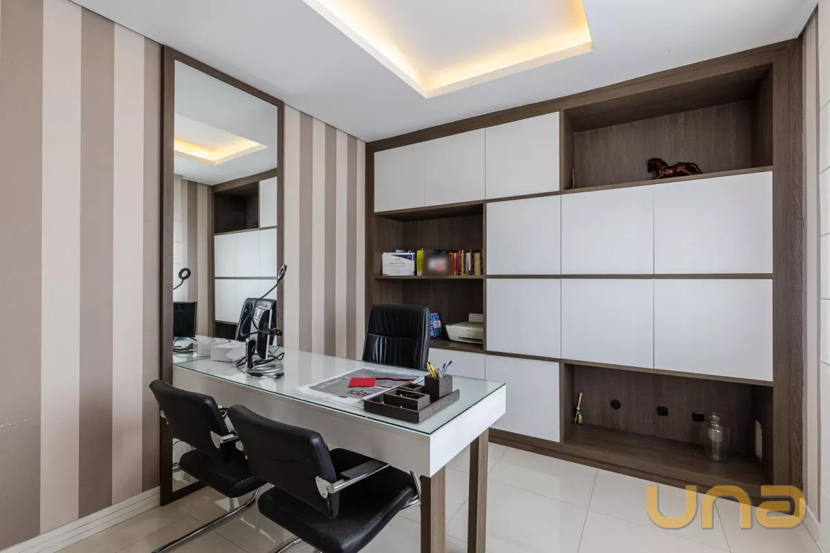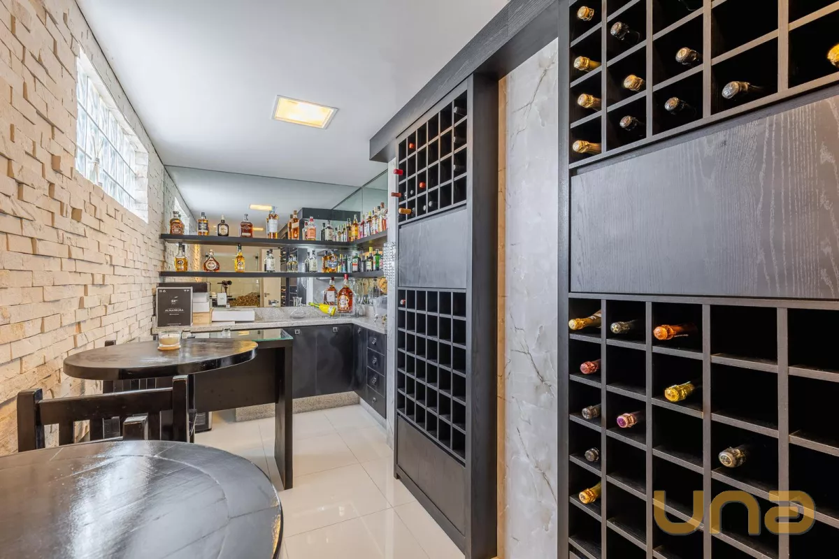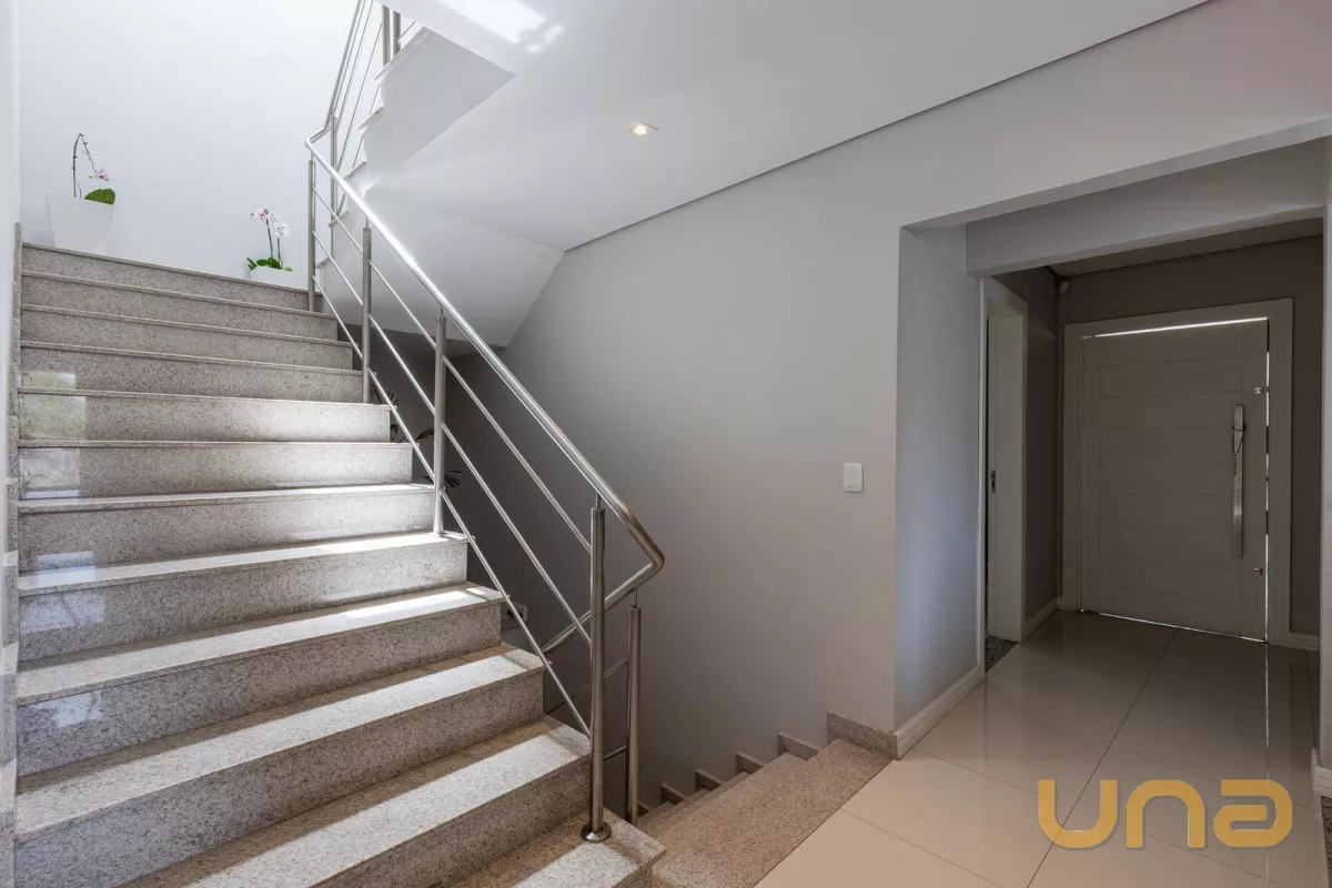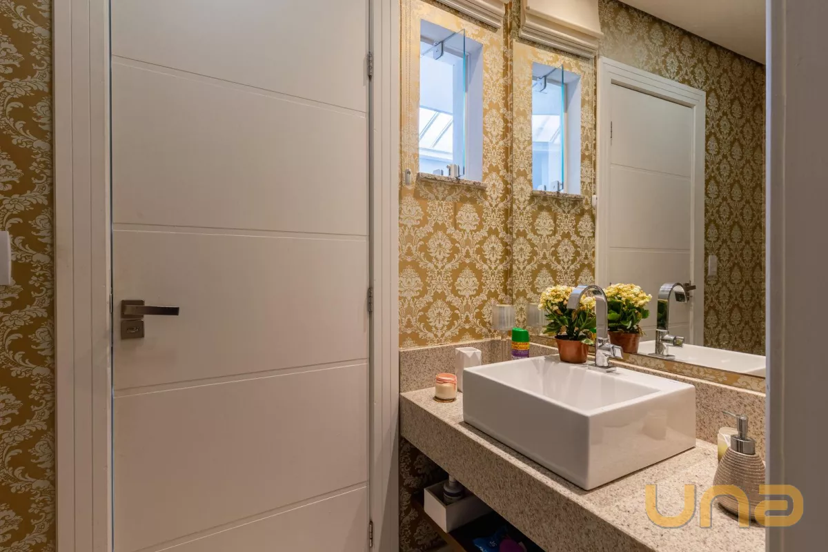 No segundo pavimento, encontram-se uma aconchegante sala de estar com lareira, uma ampla sala de jantar, escritório com estante e um banheiro social com box em vidro e tampo em mármore. O ambiente conta ainda com um espaçoso espaço gourmet, equipado com churrasqueira, bancada em granito e banheiro de apoio, além de um jardim de inverno com teto retrátil. A cozinha é ampla, com armários planejados, bancada em granito, cooktop, coifa e porta de correr em vidro, integrando praticidade e modernidade. Todo o pavimento possui piso em porcelanato.