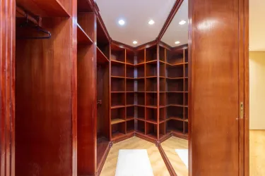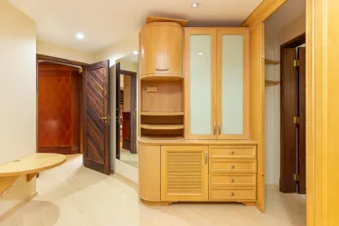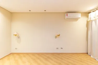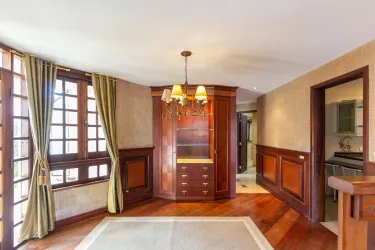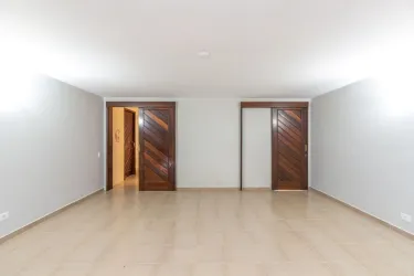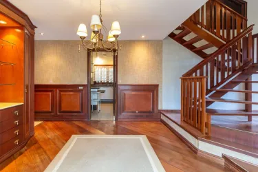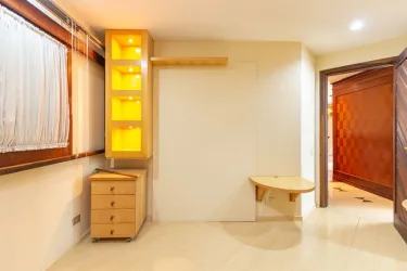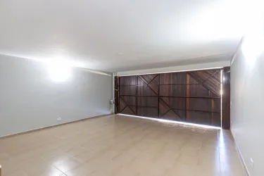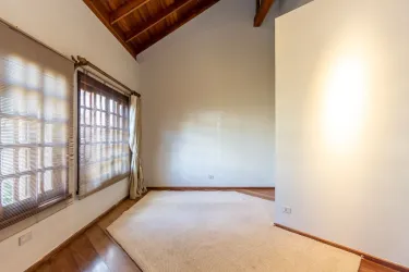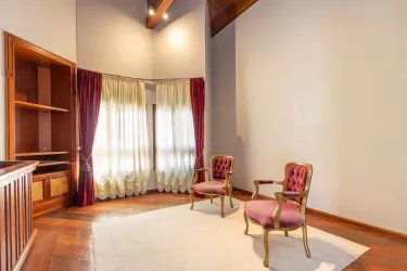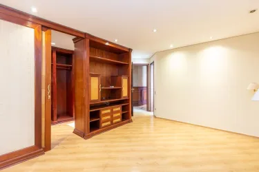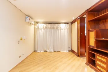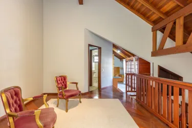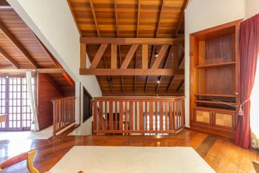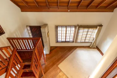 - Ampla sala para 02 ambientes, com desnível, piso em madeira, lustres e estante;