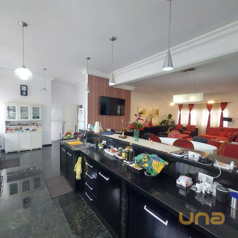 Amplo living com espaços integrados, cozinha americana com piso em granito;