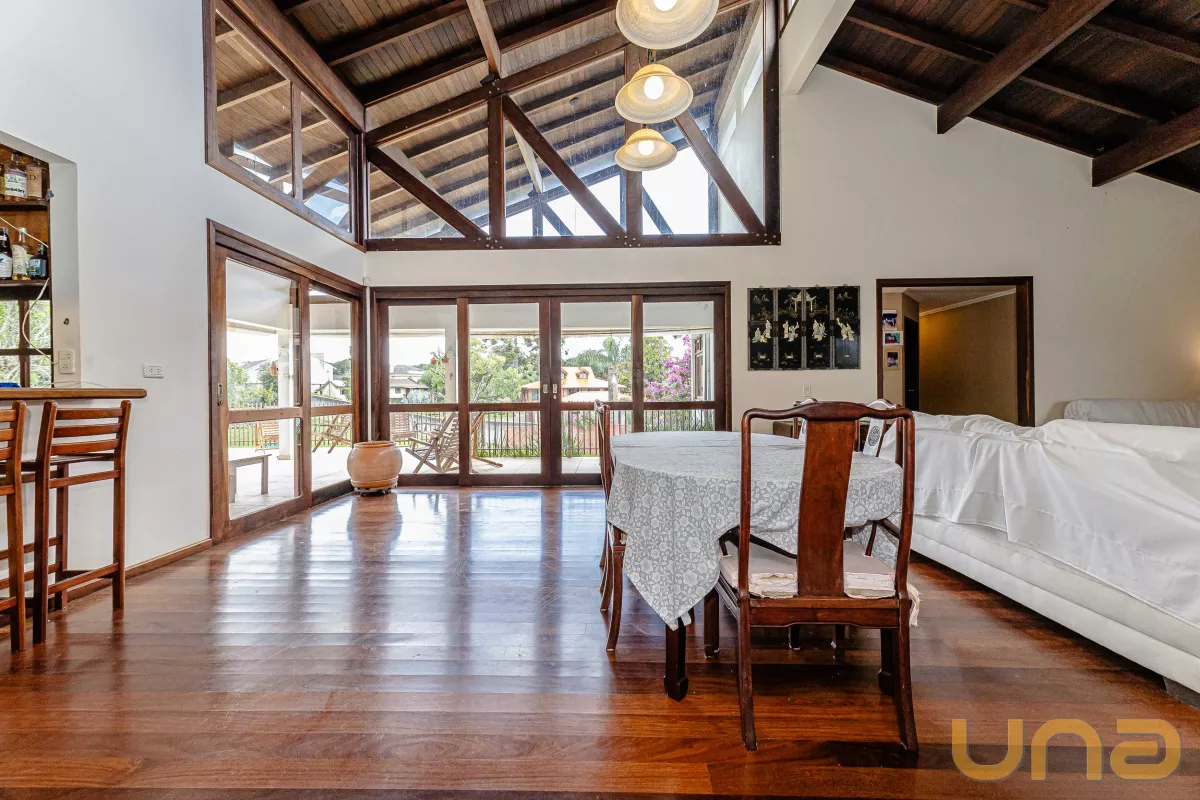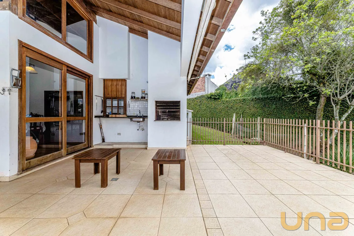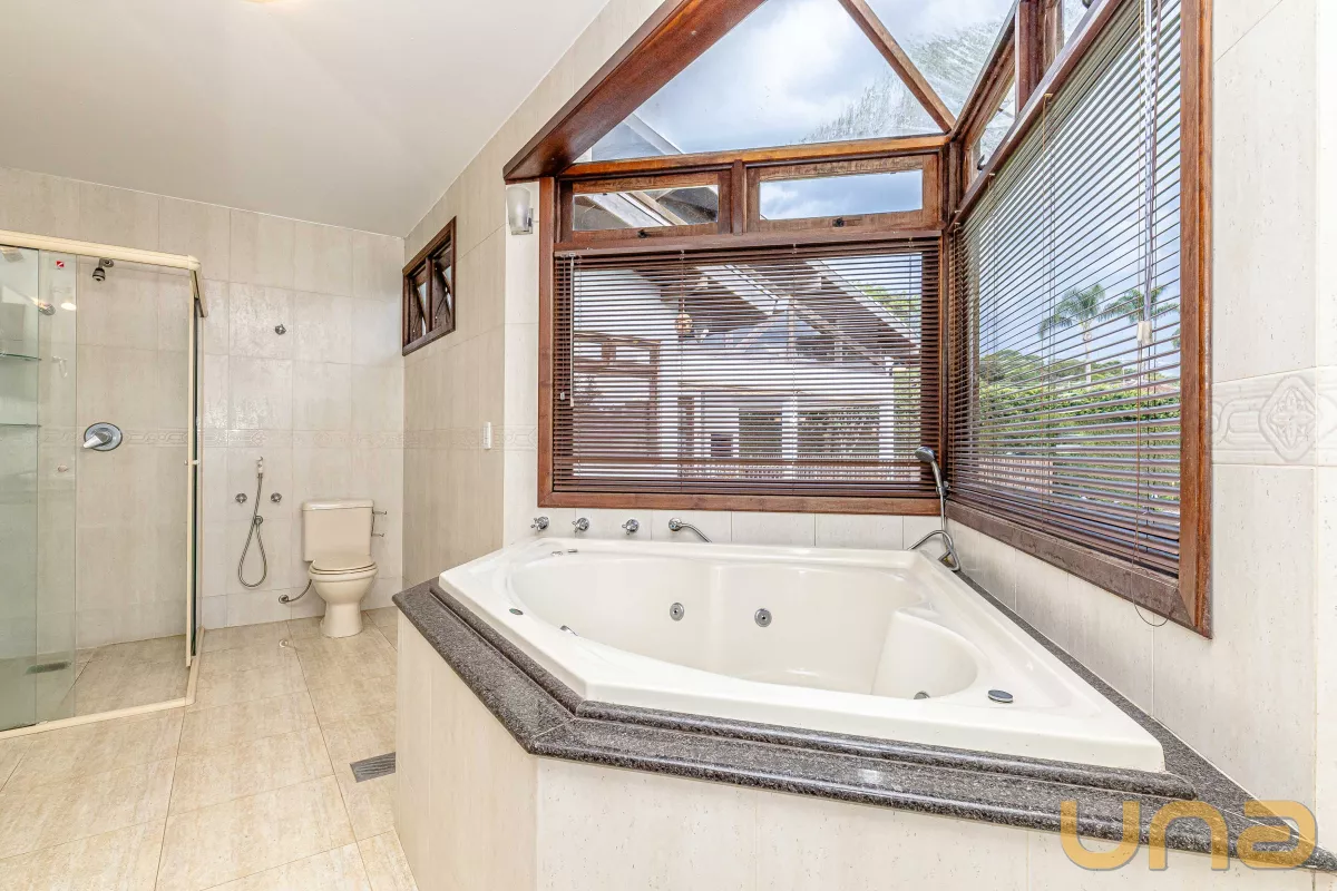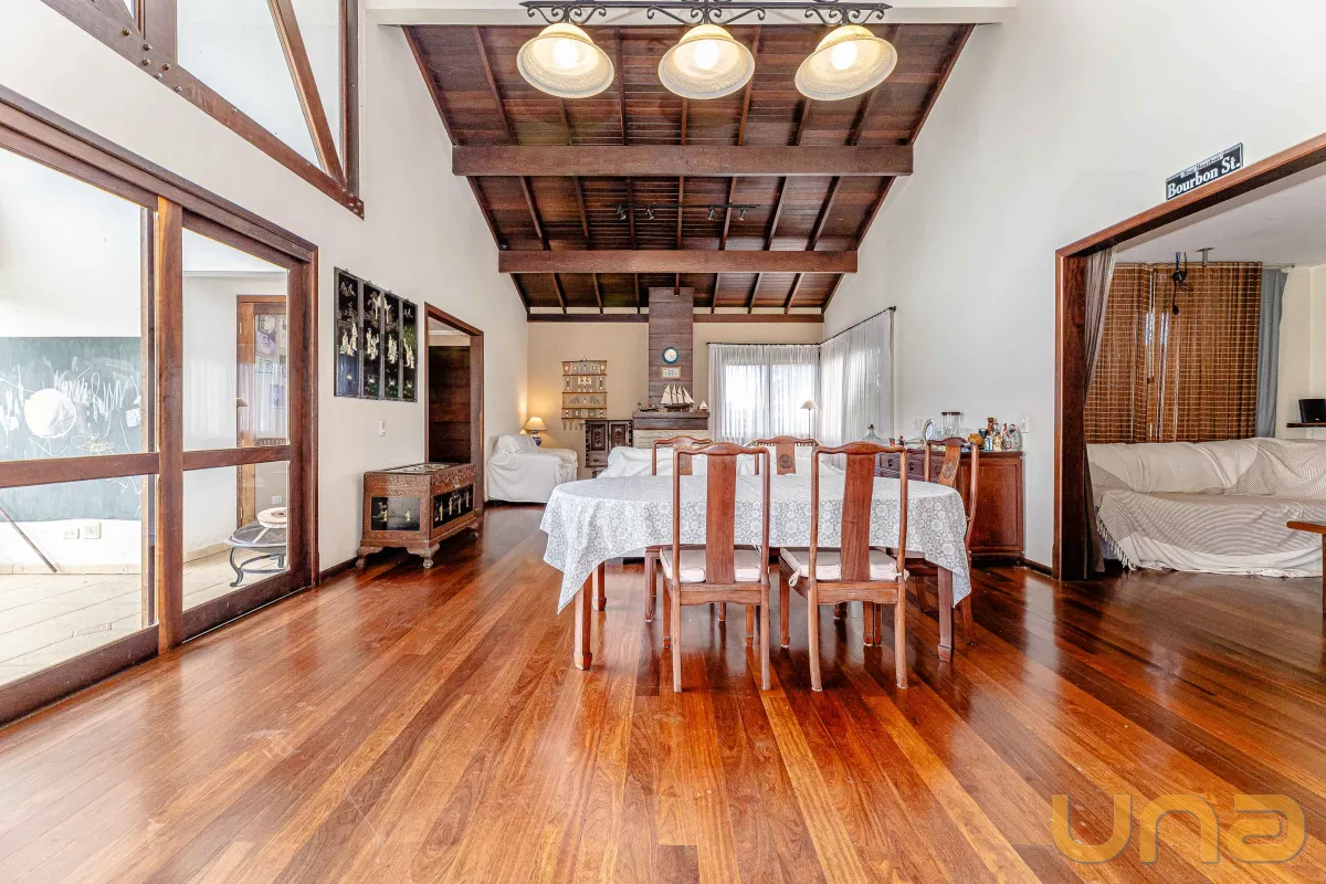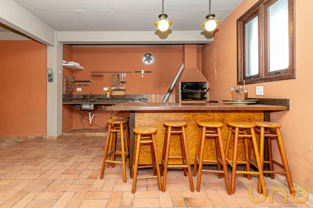 A casa conta com 4 suítes, salas de estar, jantar e íntima, copa e cozinha estilo americano com armários planejados e tampos em granito, lavabo, lavanderia, 3 churrasqueiras (1 interna, 1 externa e 1 no subsolo), abrigo para 2 carros + estacionamento para vários carros. no subsolo, um salão com churrasqueira, depósito e banheiro.