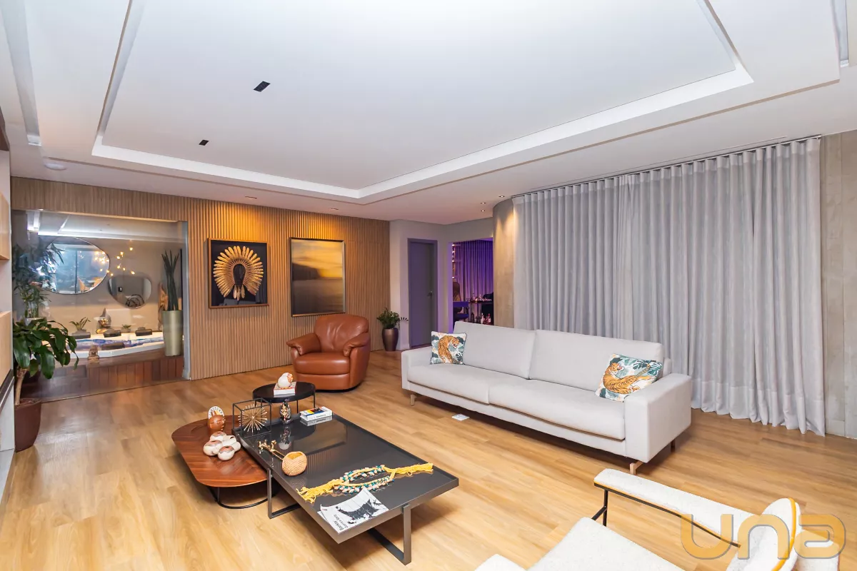 Porcelanato claro nas áreas sociais, Piso amadeirado nos dormitórios e teto rebaixado em gesso com iluminação embutida em LED