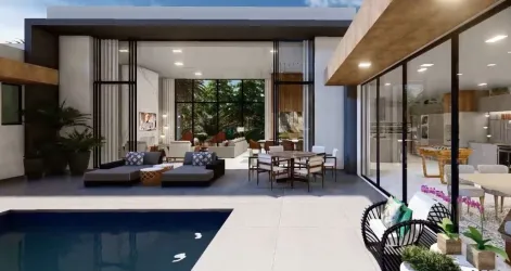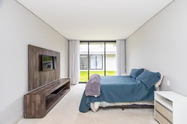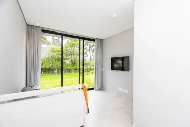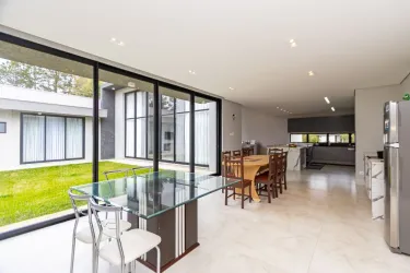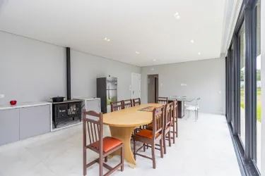 ** Ampla sala multi-ambientes acessada através de enorme porta pivotante e hall. Tudo em pé direito duplo servida por grandes panos de vidro com visão para a frente da residência e, também, para a possível piscina, como consta em projeto e campo de futebol suíço, já disponível. Lareira e no lado oposto, área de jantar e cozinha integrada com churrasqueira e fogão a lenha. Na continuação, mais espaços para mesa de almoço e acesso a quarto de hospedes, depósito, área de lavanderia e conjunto de lavabo, ducha/vestiário e BWC que podem atender à futura piscina.