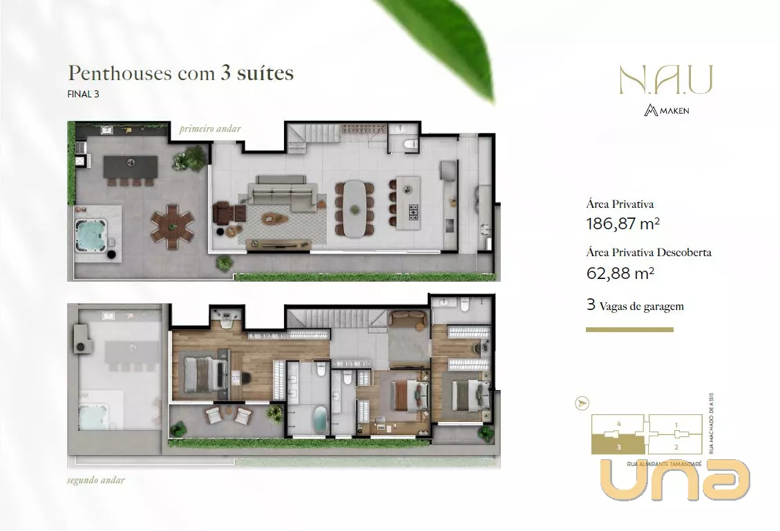 Cobertura duplex com 186,87m² privativos + 62,88m² de terraço descoberto privativo com churrasqueira, ampla sala para 02 ambientes, 03 suítes e 03 vagas de garagem.
