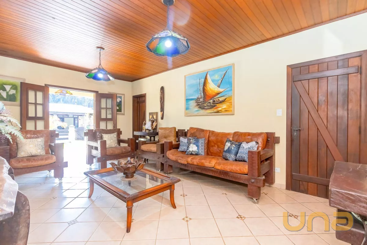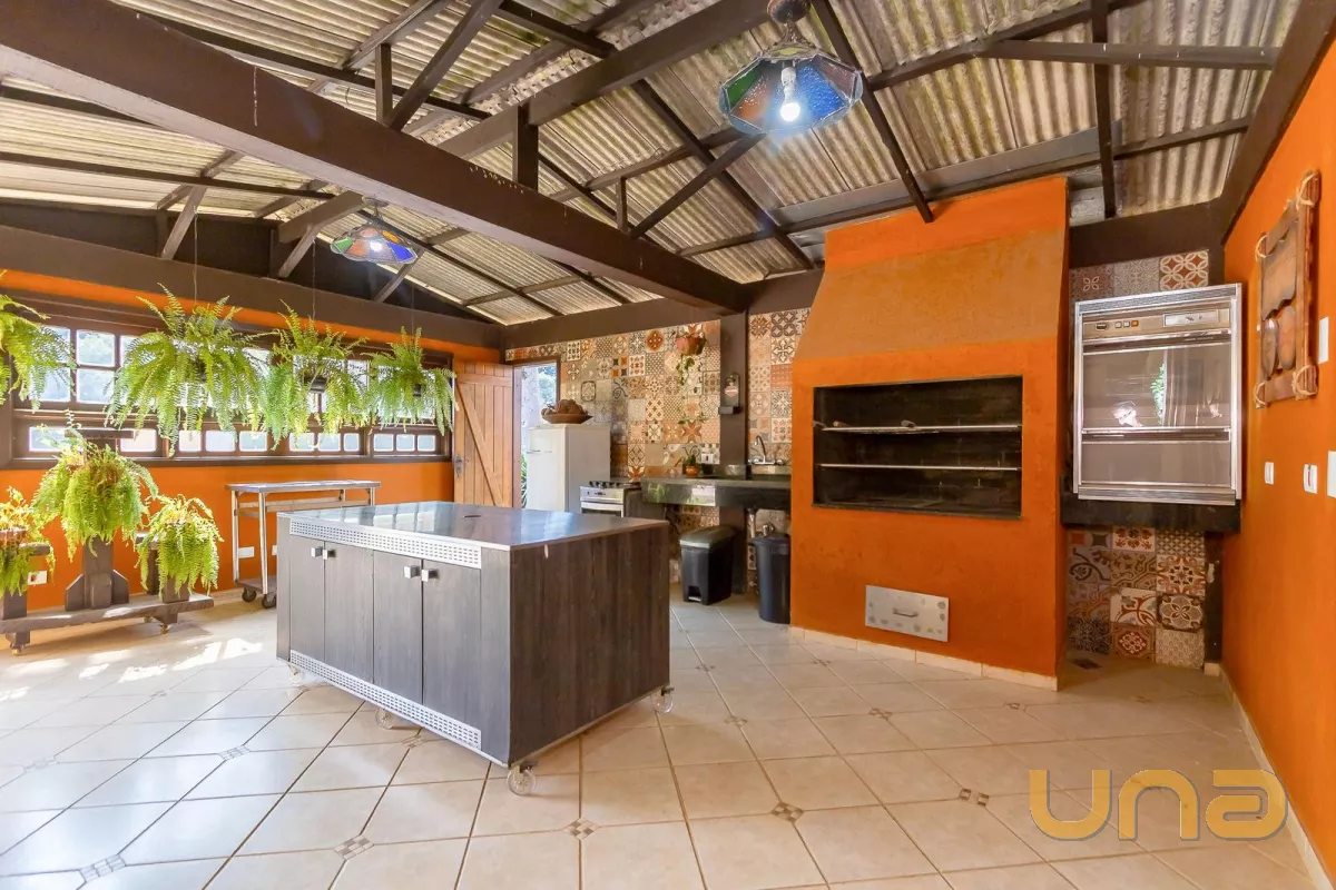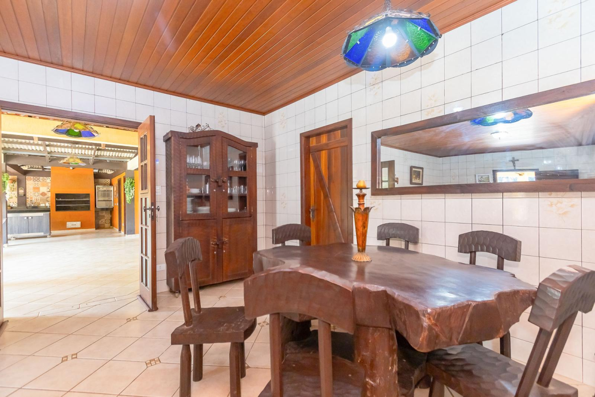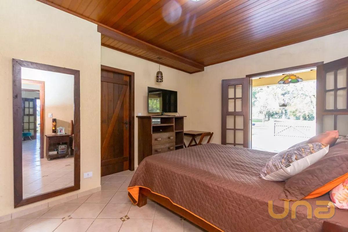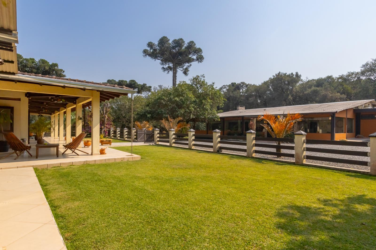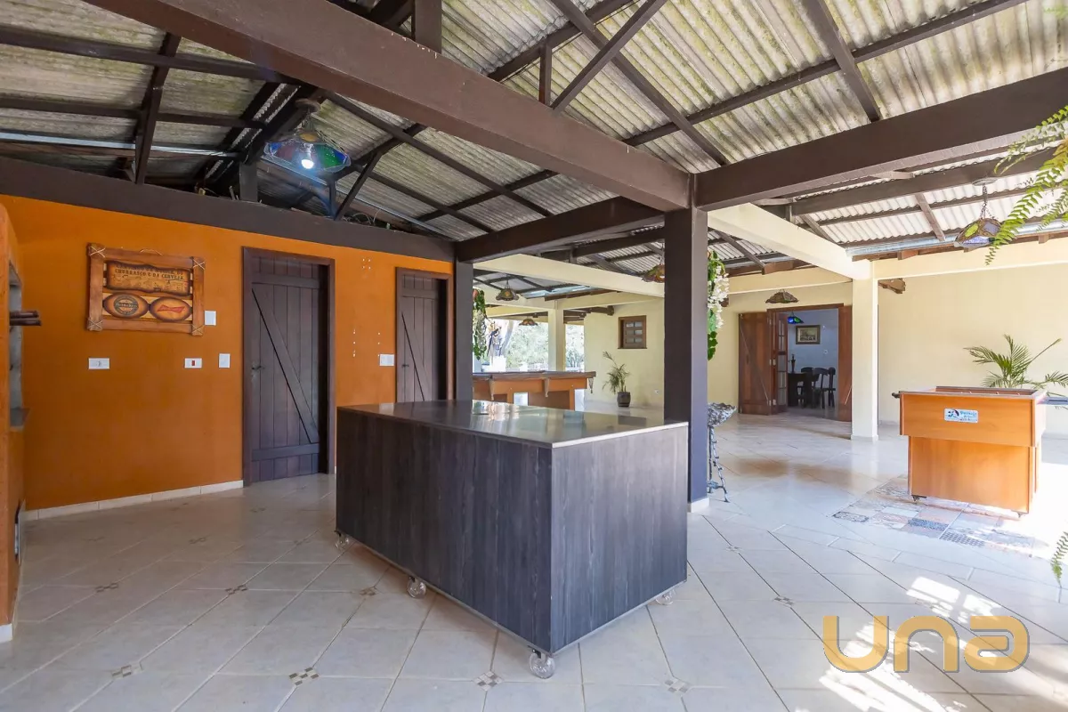Casa principal com cerca de 480m², 4 quartos sendo 1 suíte, amplo espaço social com churrasqueira, banheiros, mesa de jogos e uma bela varanda ao redor da casa. Padrão construtivo diferenciado, portas externas duplas em madeira imbuia, portas internas também todas em imbuia, varandas todas em itauba.