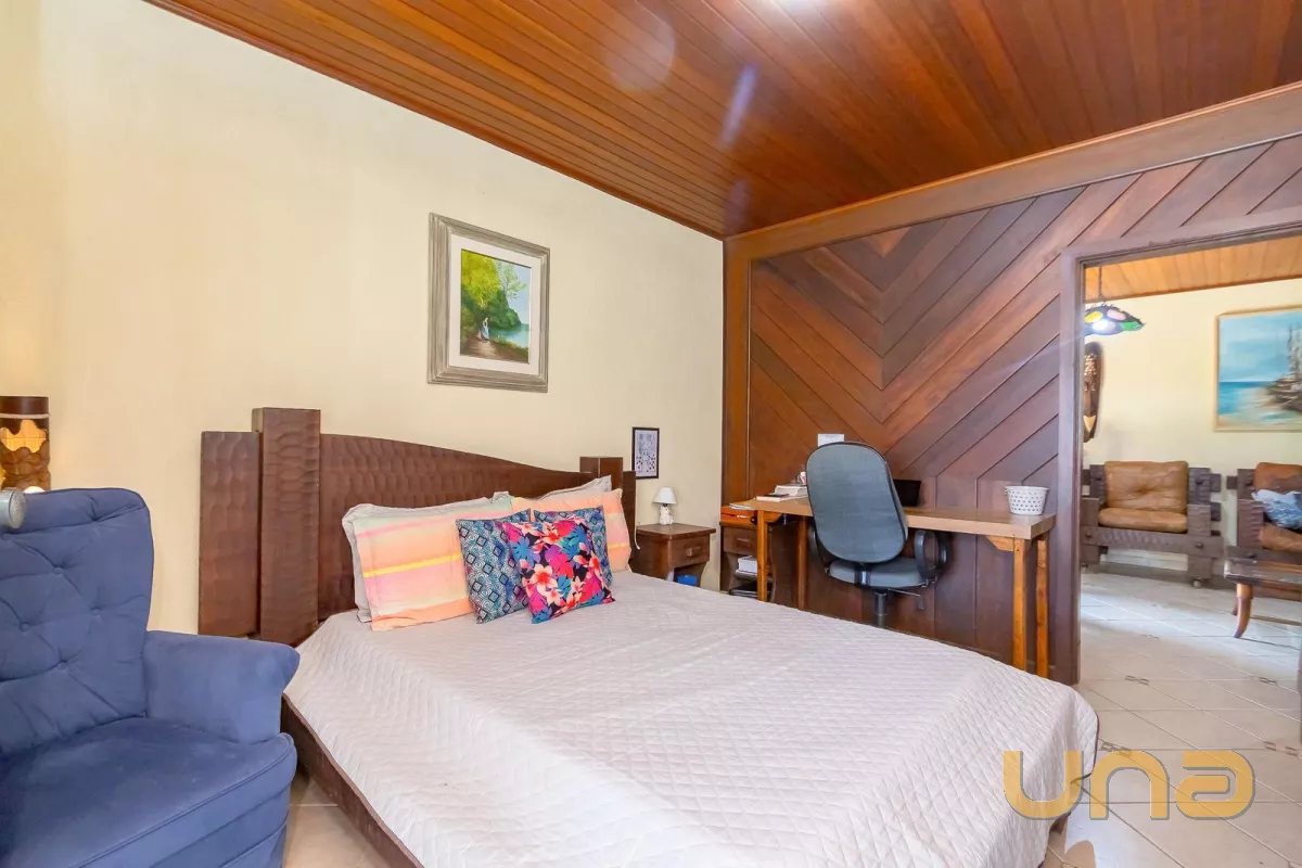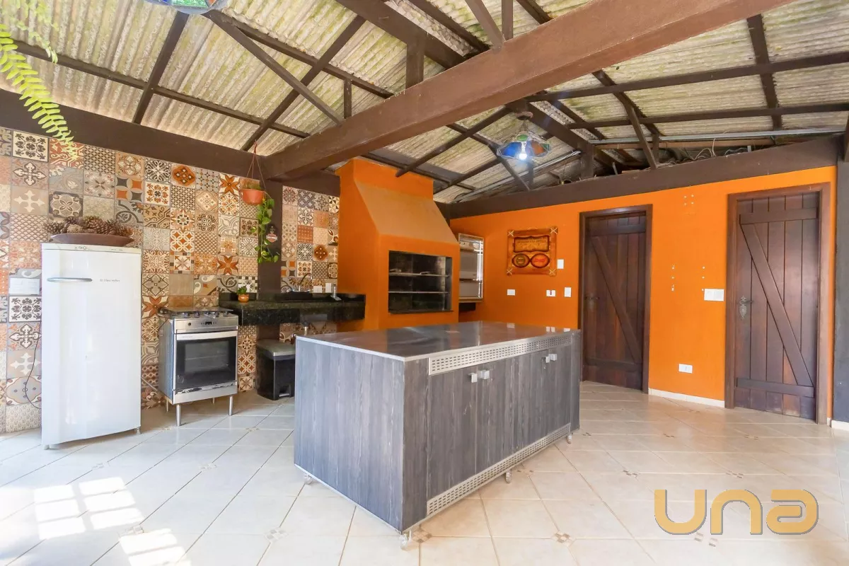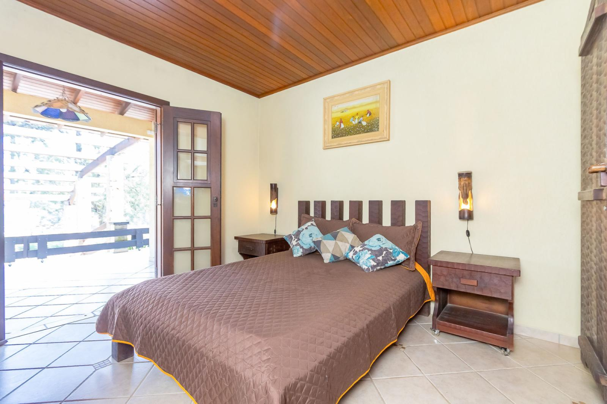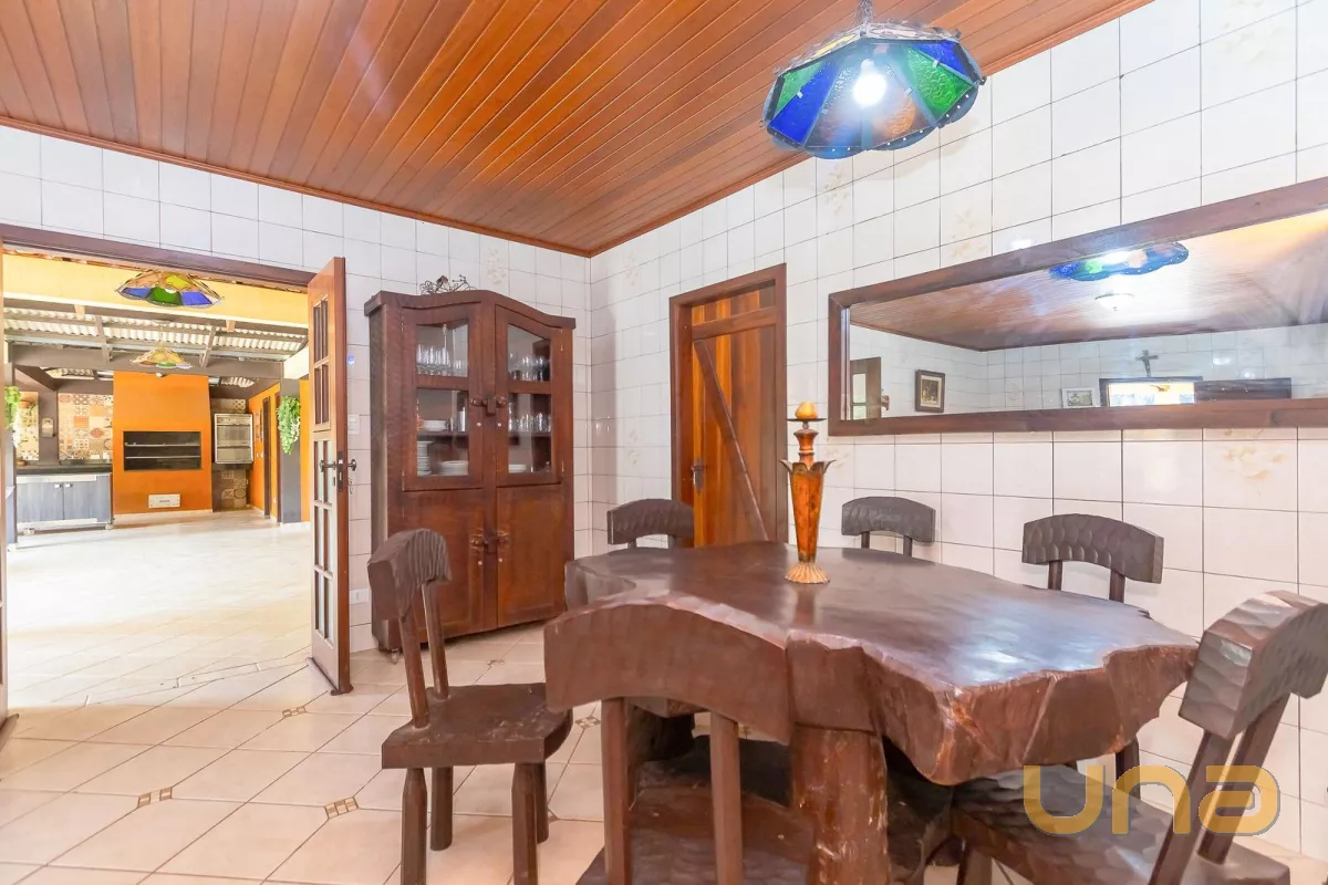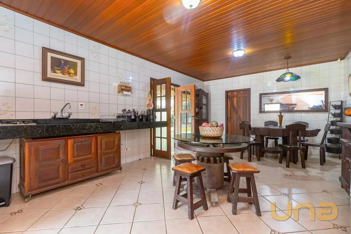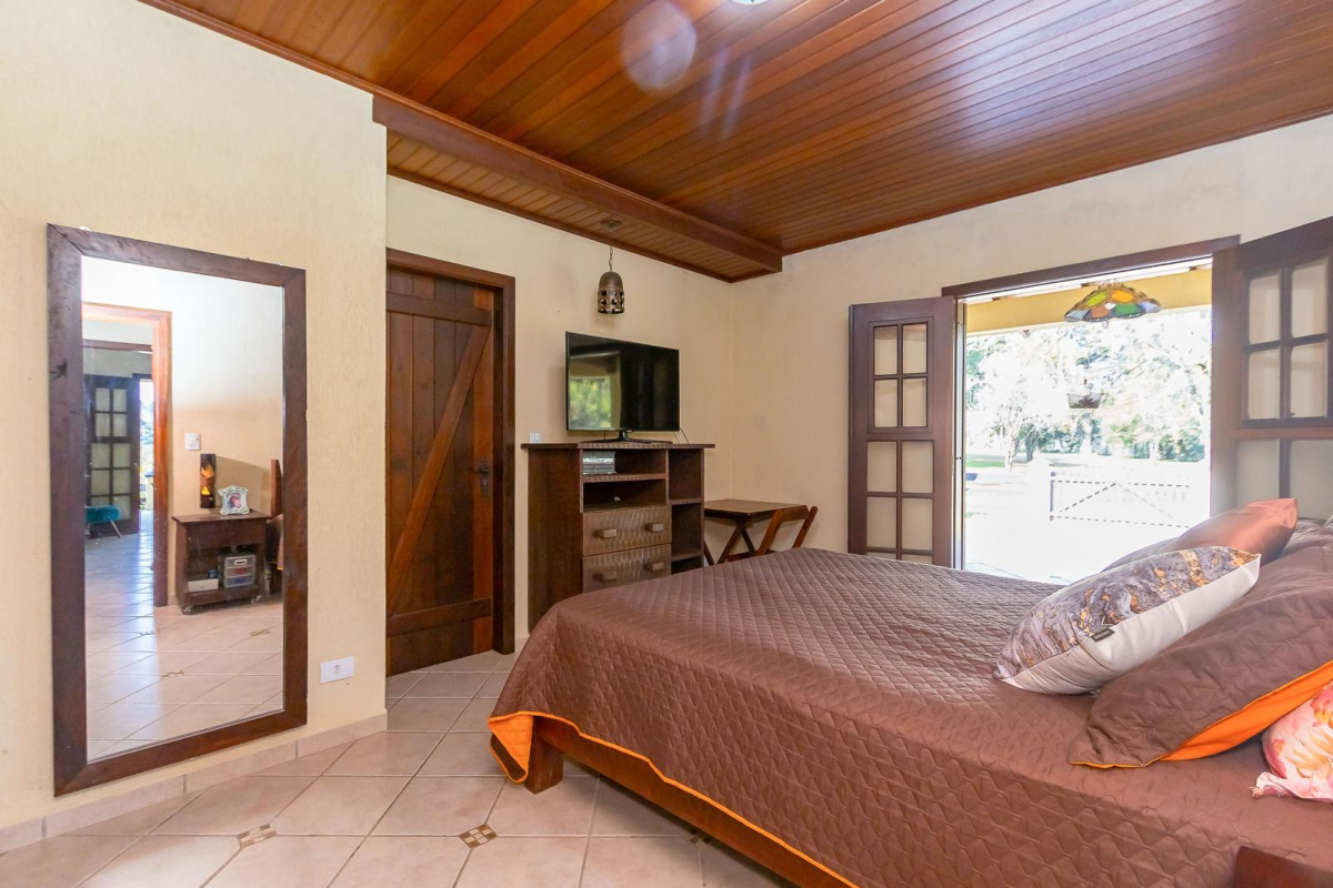 Casa principal com cerca de 480m², 4 quartos sendo 1 suíte, amplo espaço social com churrasqueira, banheiros, mesa de jogos e uma bela varanda ao redor da casa. Padrão construtivo diferenciado, portas externas duplas em madeira imbuia, portas internas também todas em imbuia, varandas todas em itauba.