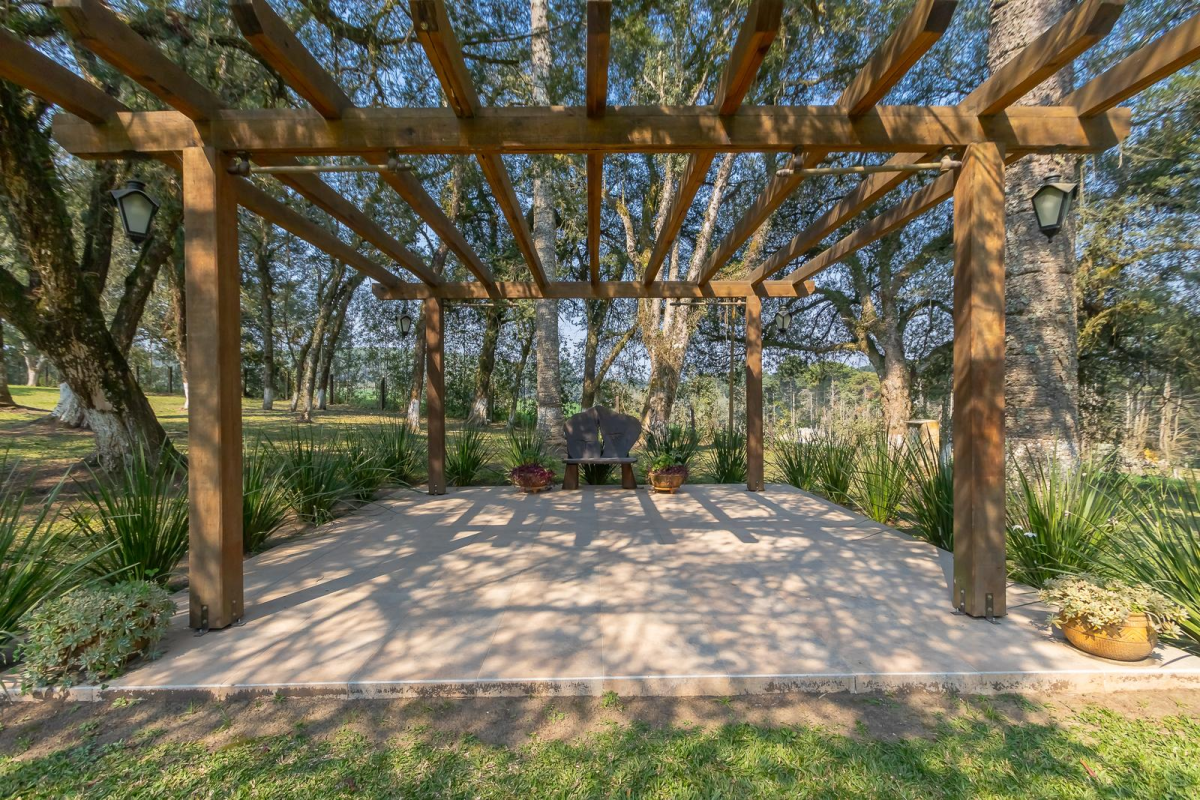 2 pergolados no jardim para cerimônias externas, lareira ao ar livre;