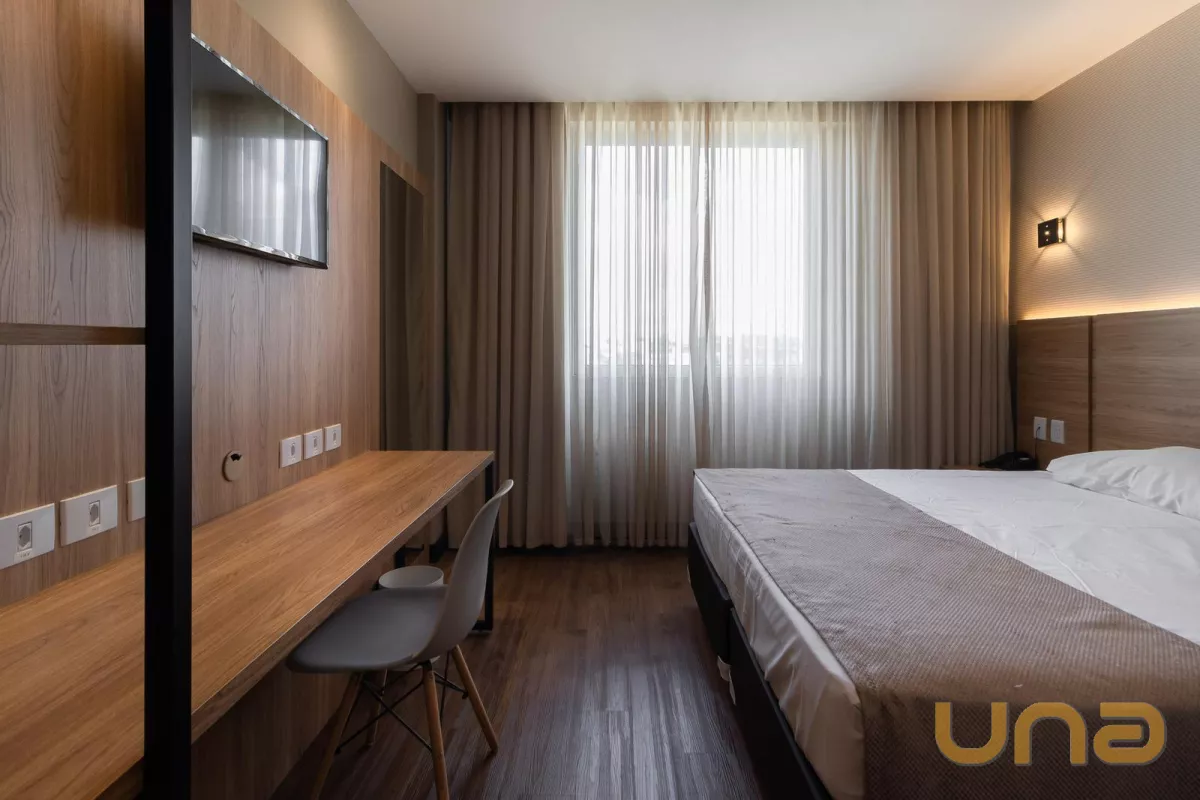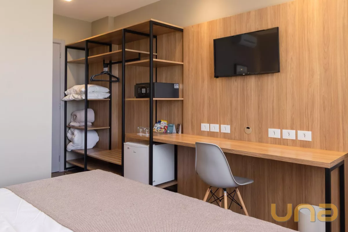 Imediações: Registro de Imóveis - 1º Ofício, Cooperativa CLAC, UNINTER. Descrição: Quarto/suíte mobiliada (tudo conforme fotos) e 1 banheiro. O hotel possui: 3 salas de reuniões/eventos, academia, restaurante para 60 pessoas, 2 vagas para recarregar carros elétricos, 3 elevadores. São 165 unidades/flats no total. Portaria 24 horas. OBS: Quando a unidade estiver ocupada/locada, a visita será realizada em outra unidade similar. Todas as unidades estão no pool de locação. Todos os proprietários de unidades do Grupo Slaviero têm 50% de desconto em qualquer unidade de qualquer empreendimento, em caso de hospedagem particular.
