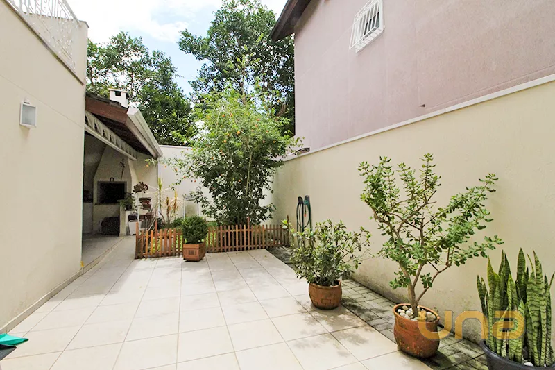 Área externa com ÁREA Gourmet com churrasqueiro e jardim em torno da casa.