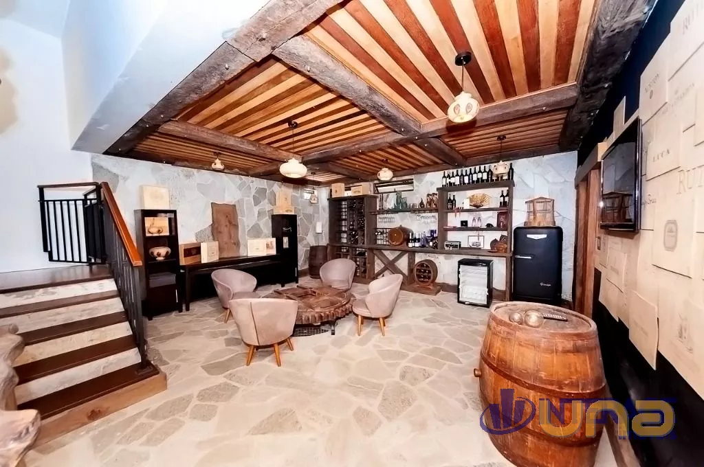 - Adega com muito espaço e conforto, revestida com pedras e madeira maciça, com poço de água natural para resfriar as bebidas na temperatura ideal.