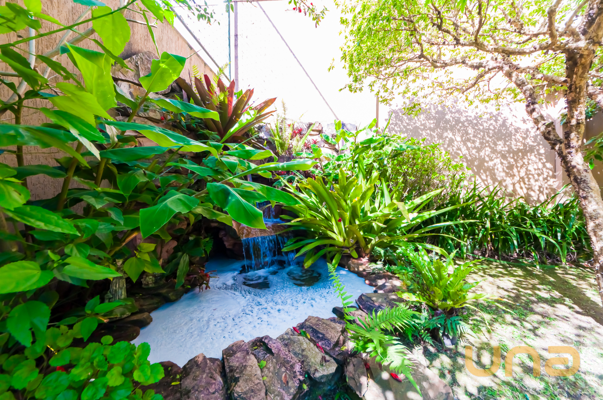 No primeiro pavimento, a casa apresenta uma ampla sala de estar e jantar integradas à churrasqueira a carvão, com acesso ao lindo jardim com árvores frutíferas e uma fonte, criando um ambiente perfeito para momentos de relaxamento ou confraternização. Ainda nesse pavimento, estão o lavabo, a cozinha com armários planejados, despensa e área de serviço.